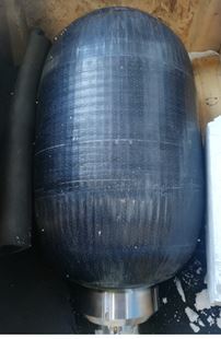 - Fabrication of the final demonstrator (Type V): Based on the results of the manufacturing activity carried out at coupon and scaled tank (8L) level, the production process was frozen. The final vessel consisted of unidirectional plies placed both in the circumferential direction and in the axial direction. Unfortunately there have been big losses in the area around the vent and on both hemispherical zones, while the cylindrical part looks to have held at the tested pressure.