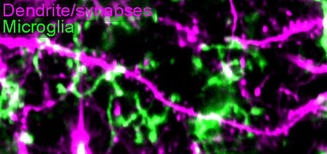 We also established several transgenic mousselines necessary for objective1. We analyzed Cx3cr1-CreERT2::a7nAChRfl/fl::Rosa26-tdTomatofl/fl mice to investigate sensing of acetylcholine by microglia. Microglia showed reduced fine processes motility upon tamoxifen-induced deletion of the a7-nAChR in microglia. Furthermore, we optogenetically modulated the activity of CA3 neurons. With activating or inactivating DREADDs, we switched CA3 neurons either ON or OFF. Since CA3 neurons send axons, the Schaffer collaterals, to the dendrites of CA1 neurons, we were able to activate or stop the release of glutamate in dorsal CA1 region of the hippocampus. We were able to show that microglial motility correlated with release of glutamate at these synapses. Furthermore, the stability of dendritic spines correlated with microglia motility supporting our hypothesis that microglia sense neurotransmitters and mediate formation and elimination of post-synapses.