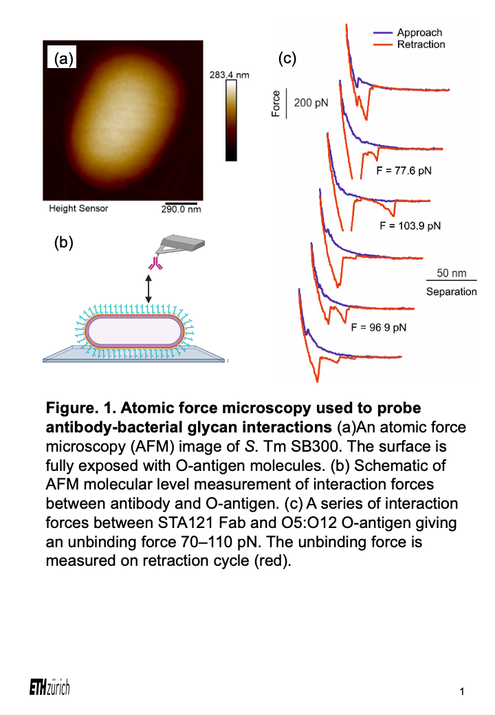 In order to investigate the biophysical properties of our antibodies, we have modified atomic force microscope cantilevers with a Spy-catcher-FAb fragment fusion protein derived from either a strong-binding or weak-binding Salmonella O-antigen-specific antibody. These cantilevers were used to measure force-distance relationships of binding/unbinding to the surface of Salmonella with different surface properties. The same antibodies were studied in IgG form for binding to purified O-antigen in classical surface-plasmon resonance (SPR) studies. Interestingly, monoclonal antibody STA5 showed 1000-fold lower affinities of binding to purified O-antigen as a (dimeric-binding) IgG, than the clone STA121, but both antibodies showed similar force-distance curves in atomic force microscopy analysis of FAb-fragment (monomeric) binding. Combined with structural data currently under analysis and our observations of the specificity of STA5 and STA121 for single-repeat and polymerized glycans, the most plausible explanation for this is that the high off-rate of STA121 is SPR is driven by avidity. We are currently extending our observations to test this hypothesis directly. As STA5 would also usually encounter highly clustered glycan molecules on the bacterial surface, it is likely that avidity, rather than affinity is also a major driver of bacteria-antibody interactions. The consequences of multi-valent interactions for the strength of crosslinking between bacteria of dimeric IgA will be tested and modeled in the next months. These observations are also soon to be extended to bacterial capsular polysaccharides, starting with the MenA capsule from Neisseria meningitidis.