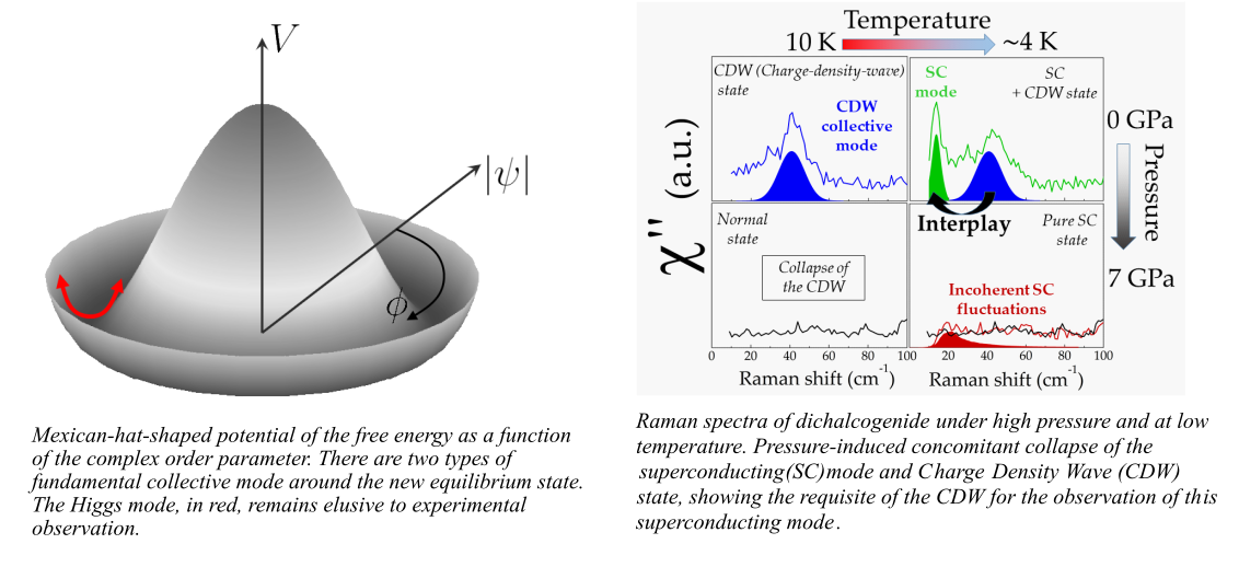 The project will use a potential mechanism of observability making the Higgs mode detectable by Raman spectroscopy, based on the interplay between an adjacent quantum order and superconductivity. The overall objective of the project is to contribute to the quest of new observations of Higgs mode in superconductors, to study them in a large variety of situations, by changing the type of adjacent quantum orders, by changing the type of superconducting orders or by changing the dimensionality. For this, we will use advanced Raman spectroscopy, notably under extreme conditions, beyond the state-of-the-art experiments. This project will establish definitive examples of the observation and mechanism of observability of the Higgs mode in superconductors, while developing its phenomenology to address major problems at the frontier of quantum materials research, with impact beyond mere superconductivity and even condensed matter.