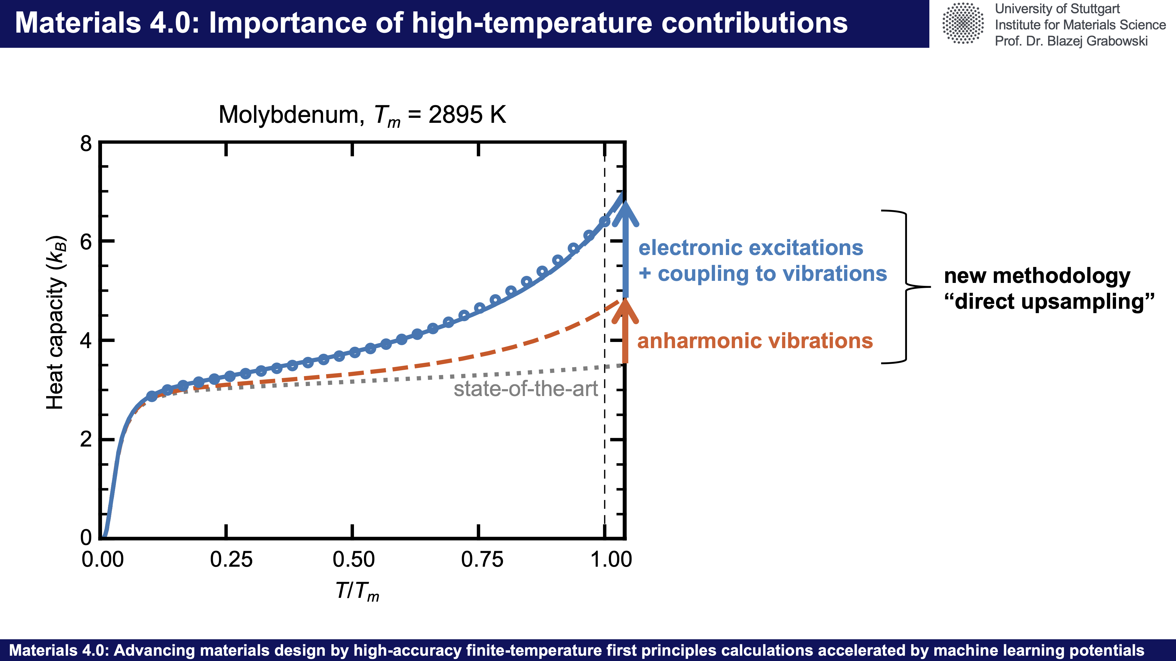 In the second figure, the heat capacity of Mo is repeated, however, with additional curves included. The gray dotted line marks the result obtained with the state-of-the-art low- temperature approximation (quasiharmonic approximation) available prior to direct upsampling. It is obvious that this result severely underestimates the true experimental curve. Utilizing the novel direct upsampling methodology, we can see that anharmonic vibrations (red) and electronic excitations including coupling to vibrations (blue) contribute significantly at high temperatures, bringing the final result close to experimental data. In general, all relevant high-temperature excitations need to be included to obtain an accurate prediction of thermodynamic properties. This is achieved by the direct upsampling methodology.
