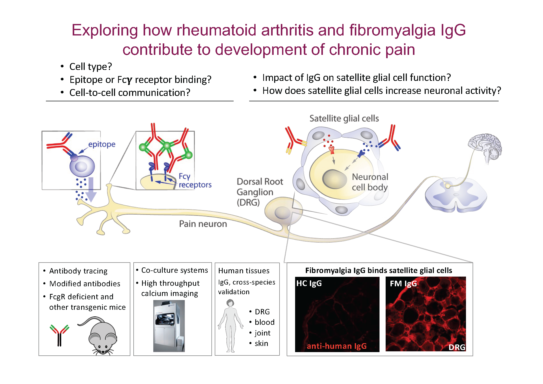 Our research explores how the immune system and specifically a type of antibody called IgG may contribute to chronic pain in fibromyalgia (FM) and rheumatoid arthritis (RA).