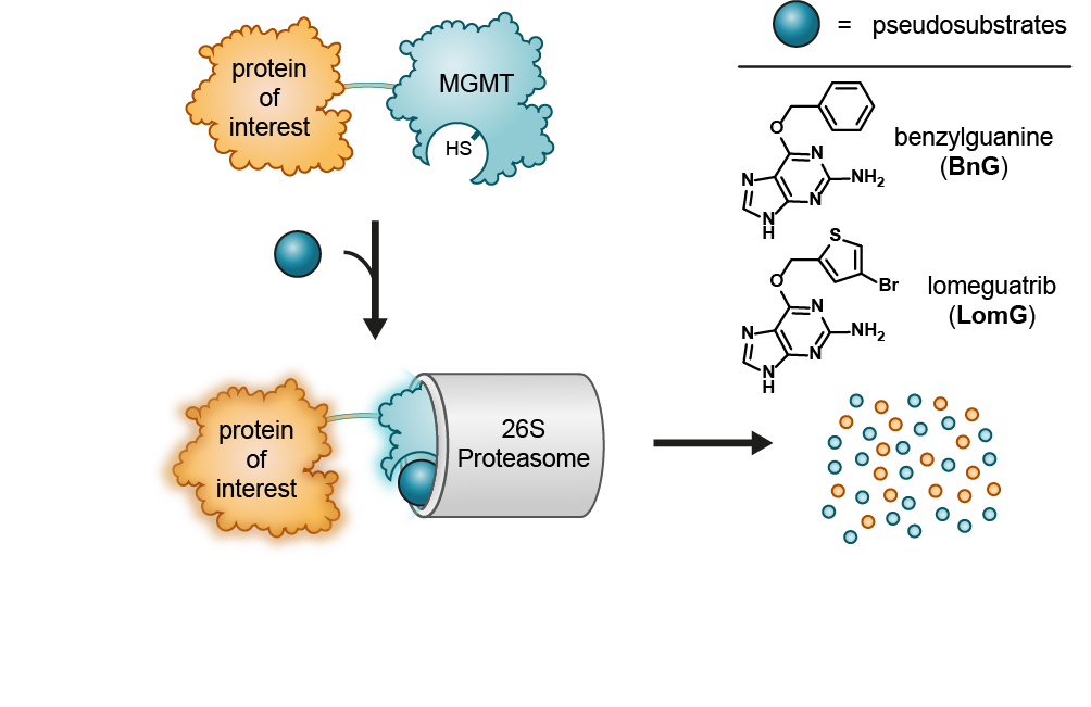 We applied the DNA repair enzyme MGMT as a new inducible protein degradation system. By fusing MGMT to a protein of interest, we enabled the degradation of that fusion protein on demand with a small molecule. This approach was published in ACS Chemical Biology and is already being used to study dynamic protein function.