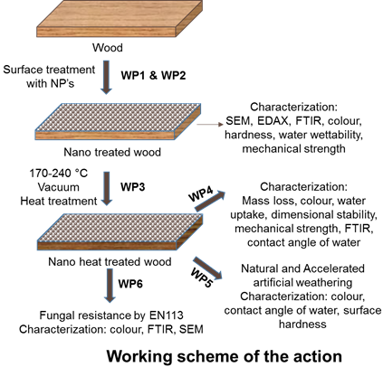 Convenient thermal modification parameters for wood (mainly beech wood, but some other wood species were also investigated) were set up. It is important, that two treatment procedures were found to be possible: at first, wood was thermally modified and afterwards impregnated, or it was firstly impregnated and only then thermally modified in vacuum. This second option represents a novelty in this filed of the research. In continuation, various properties (humidity, water uptake, hydrophobicity) of variously treated and control samples were determined. The most important parts were WPs 5 and 6, where UV stability of the treated wood samples was evaluated and fungal resistance assessed, respectively. While in the case of UV stability the reverse order of protection of wood (at first impregnation with nano particles and only then thermal modification in vacuum) did not show any benefits, in the case of protection against fungal decay, among all samples, the best protection was assured exactly by this method.