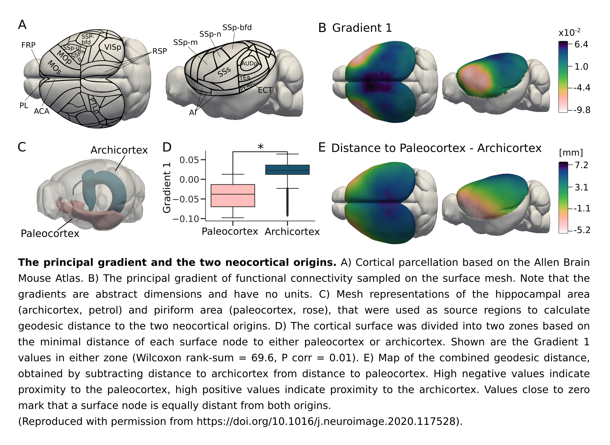 We found that the first, or principal, gradient of functional connectivity shows a striking overlap with a spatial axis between two regions that have previously been described as the evolutionary origins of the cortex, the archicortex and the paleocortex (see Figure). Additional gradients reflect sensory specialization as well as a hierarchy from primary sensory regions to areas associated with higher cognitive functions. We believe that these spatial gradients reflect fundamental organizational principles of the mouse cortex, such as a) the evolutionary trajectory of cortical growth from the two origins, and b) the specialization of the cortex to process sensory information and abstract that information in order to inform higher level functions. While some of these gradients strongly resemble observations in the human cortex, the overall pattern in the mouse cortex emphasizes the specialization of areas that process direct sensory input from the environment, over a global functional hierarchy that enables higher level cognition in humans.