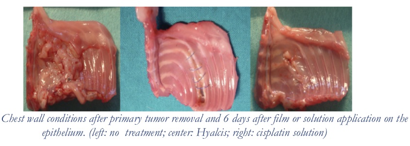 3) Safer and very efficient drug administration. The sheep study has been aimed also to test in large animals the pleural application of cisplatin/hyaluronate film, in order to assess the film handle ability in surgical practice, drug release and bioavailability. The film application had no critical risks for surgery personnel, unlike the intrapleural cisplatin solution that could leak from the cavity, due to the pressure applied during surgical suture.