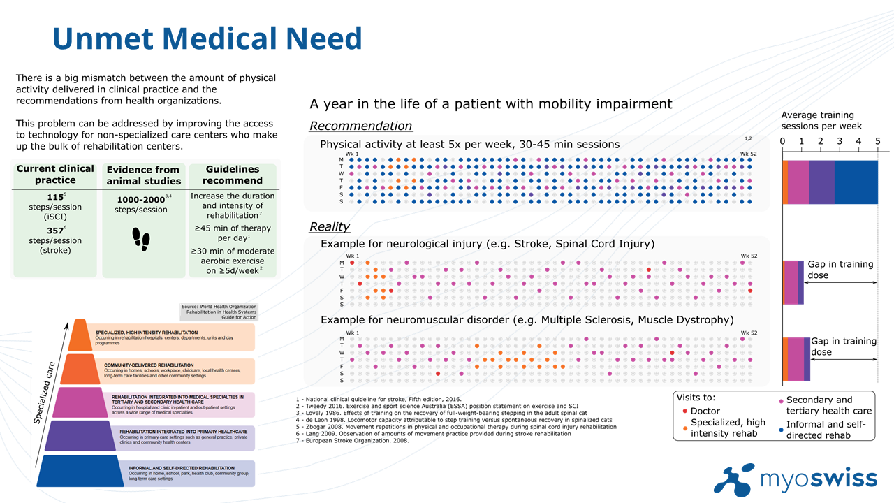 An additional development has been on digital products that support training with the Myosuit. The Myosuit is supported by two additional technologies: 1) Myosense–a cloud platform that aggregates and analyzes the movement data tracked while patients train with the Myosuit, and 2) Myotraining—and intelligence engine that designs personalized training plans for patients based on their goals and needs for training. This combination makes up the MyoSwiss platform."