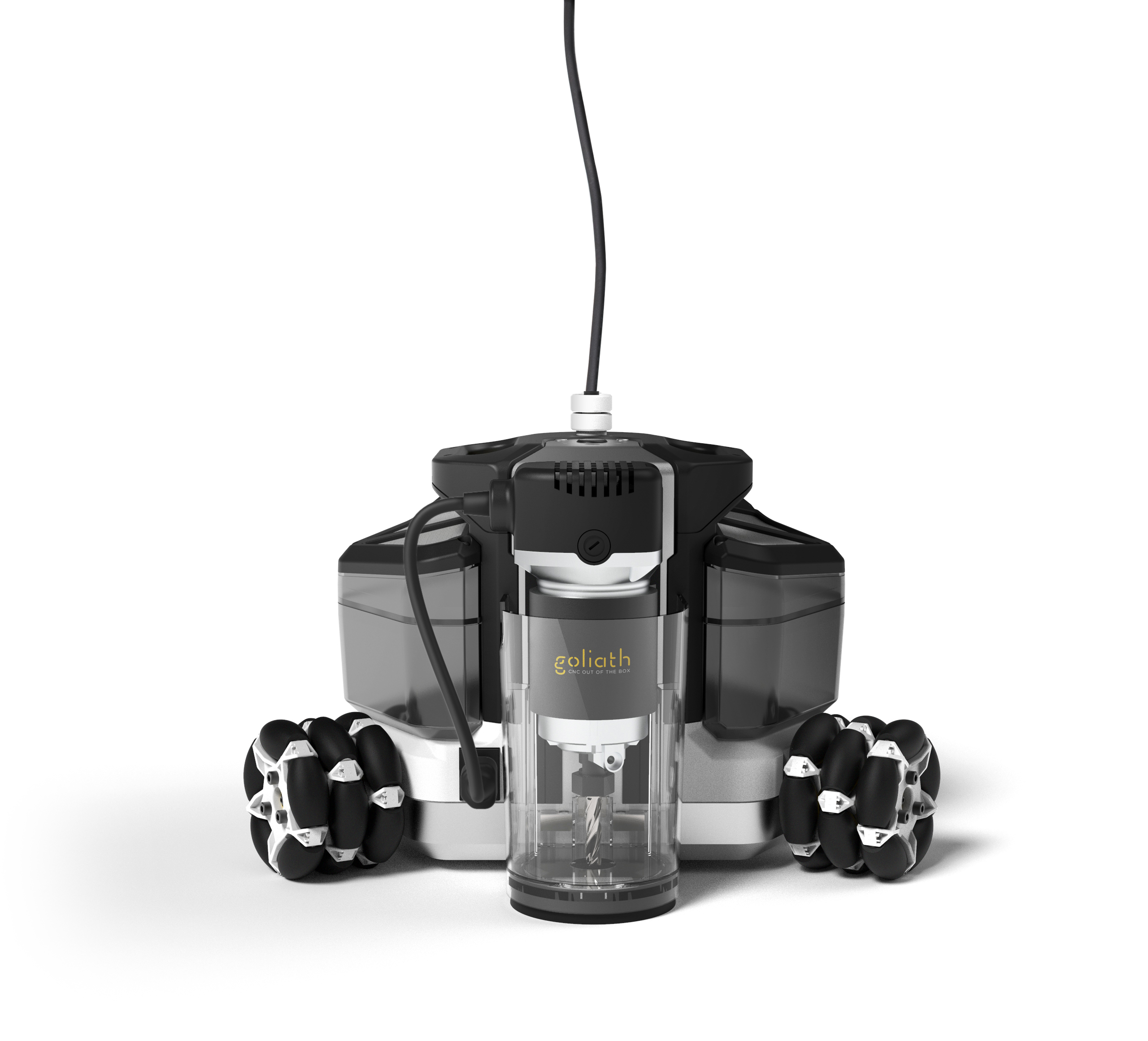 - The first portable milling tool, due to its limited size and weight. Currently available milling machine need to be as large as the working area for the piece to be cut. Goliath moves around the piece, which allows it to keep a very limited size. The robot is designed with two handles on top, which enables it to be lifted to work either on table-tops or on the ground, to be used also outside the production site (for instance, in a construction site), and to be simply stowed after usage.