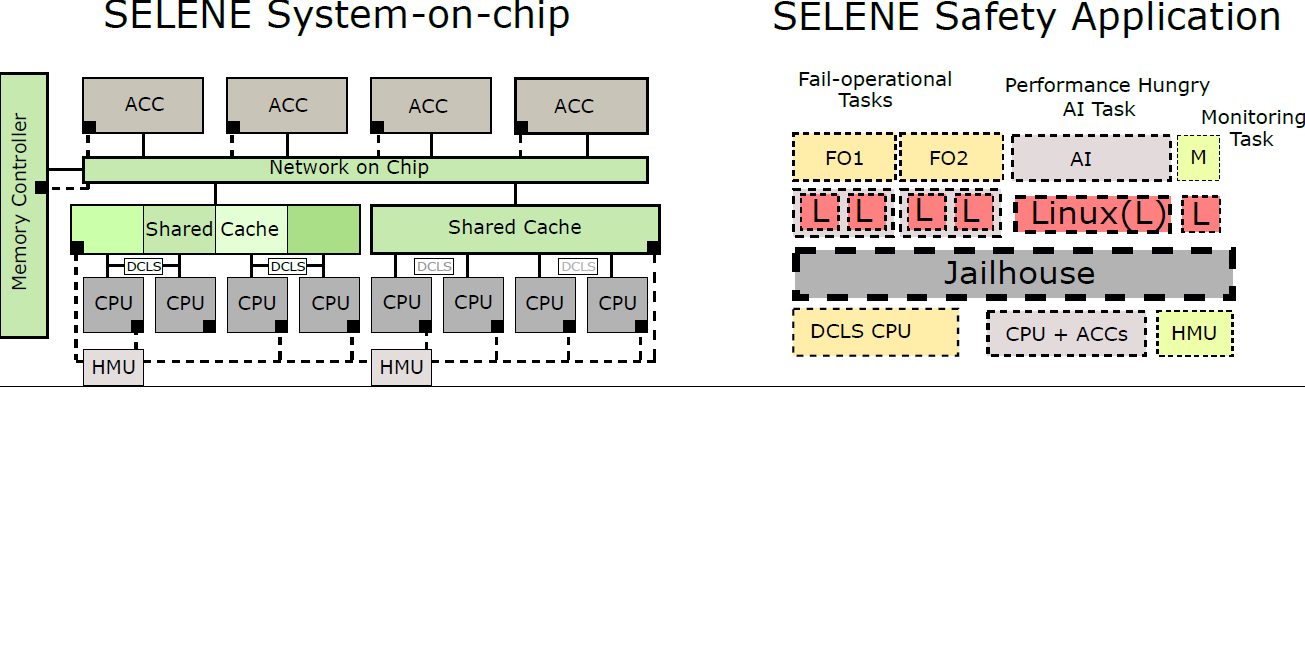 The objective of the SELENE is to cover this gap in the design of safety-critical HW/SW systems, by proposing a new family of high-performance safety-critical computing platforms that build upon open-source components such as RISC-V cores and GNU/Linux. The SELENE platform implements several mechanisms for flexible diverse redundancy, supports compute intensive applications using specific accelerators for artificial intelligence and cryptography, and includes partitioning and monitoring capabilities that ease the integration of applications of different criticalities.