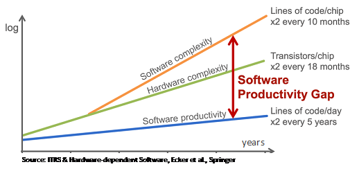 AMPERE addresses the software productivity gap existing between the complexity of the software systems required to efficiently exploit the performance capabilities of these advanced processor architectures, and the low software development productivity when addressing these type of architectures (see Figure below). This gap is further exhacerbated by the difficulty of fulfilling the non-functional requirements imposed by the cyber-physical system in the presence of parallel execution.