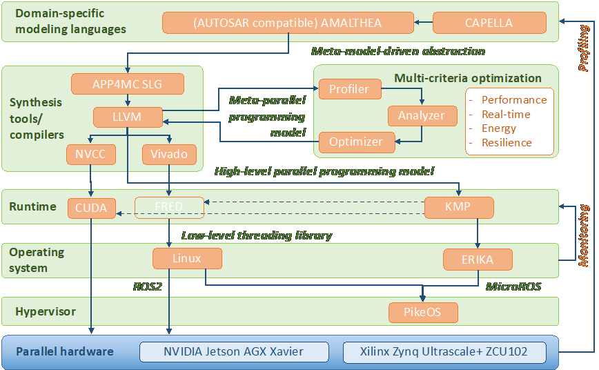 • A run-time environment that constantly monitors time and energy, and adapts the execution to better fulfil the non-functional requirements and a hypervisor and a set of operating system festures that provide safety and security mechanisms, while supporting the OpenMP parallel execution model.