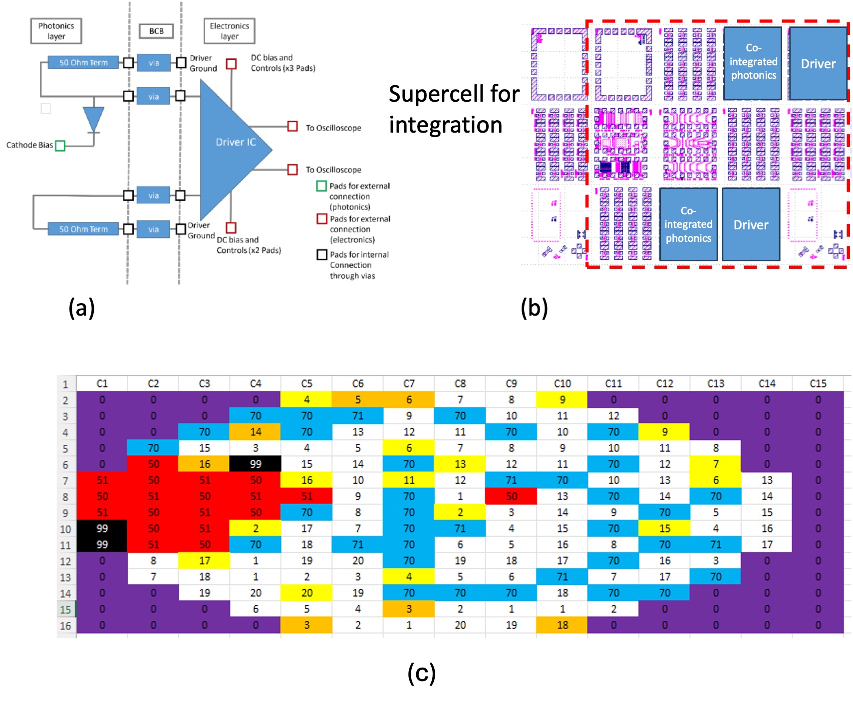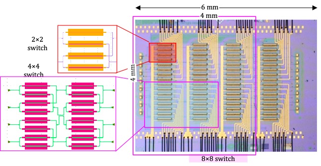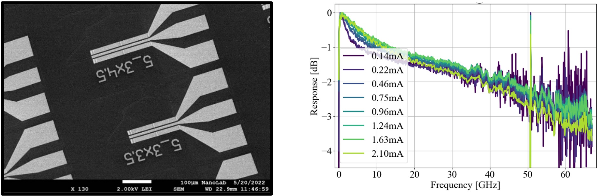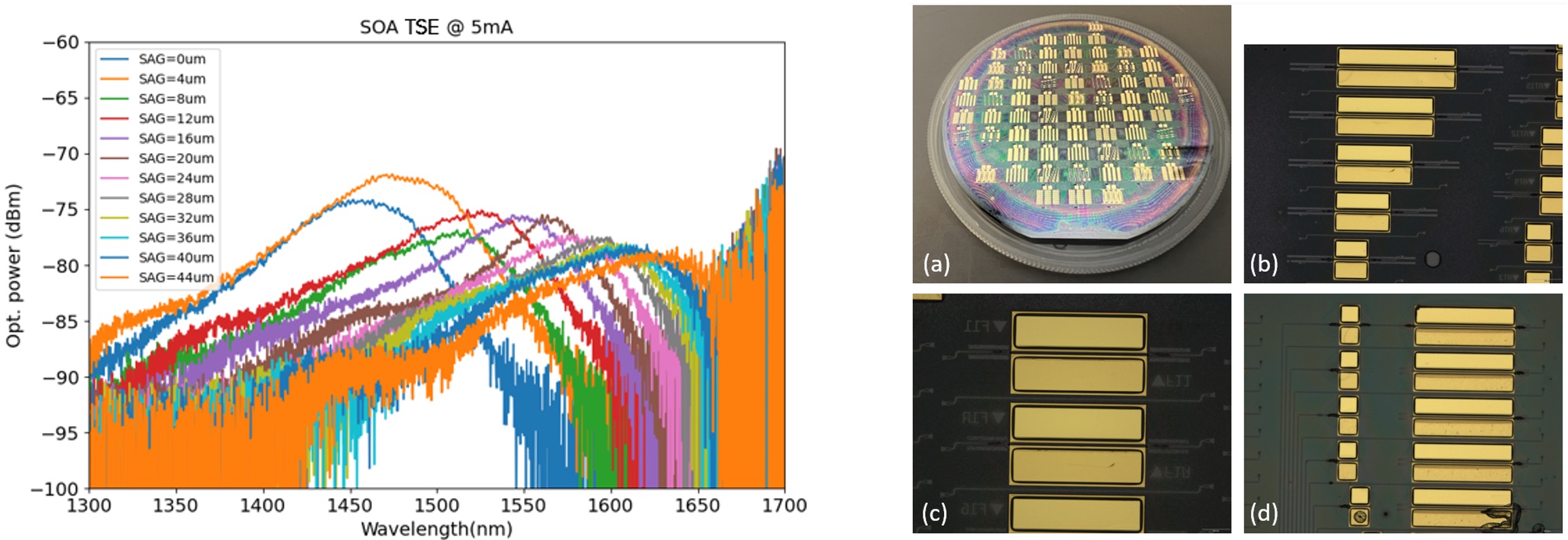 WP3: The photonics components for the transmitters, receivers and switches were developed. An advanced Selective Area Growth (SAG) technology was implemented on InP membrane platform, enabling multiple MQW bandgaps on the same wafer (Figure 2). DFB lasers were designed and fabricated with stable operation and high side-mode-suppression ratio (SMSR) across a record wavelength tuning range (1458.9 to 1592.4 nm). Thermally shunted EMLs were designed and fabricated with significantly reduced thermal resistance and enhanced dissipation efficiency, improving the operation stability and longevity under high-power conditions. In addition, new thermal models and parameter extraction techniques were developed to assess and optimize device heating, allowing precise control over performance characteristics under various operating conditions. Two generations of UTC photodetectors were designed and fabricated (Figure 3) and a final run of UTC-PDs based on the developed co-integration process was designed and processed (see WP5 below). Finally, polarization insensitive semiconductor optical amplifiers (PI-SOAs) were designed and fabricated showing low polarization dependence. C-band 8x8 switch PICs based on different architectures were developed (Figure 4).