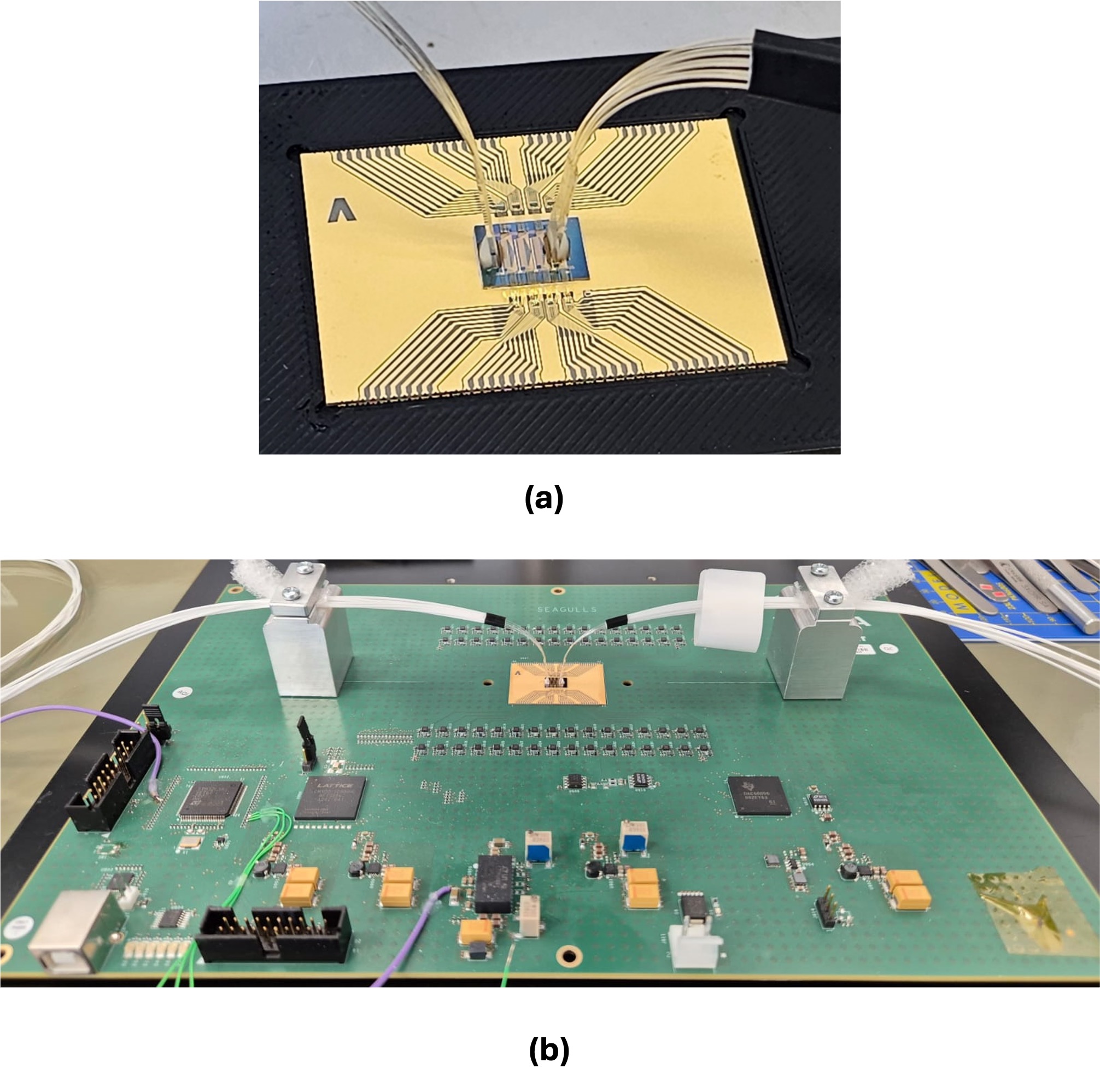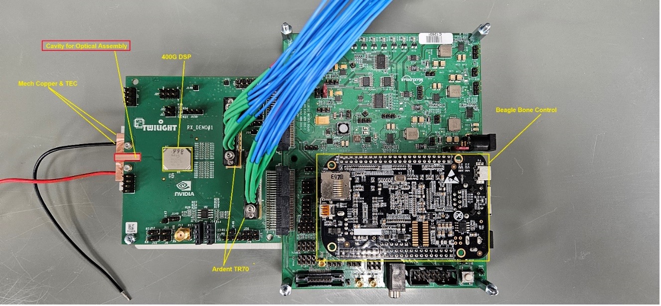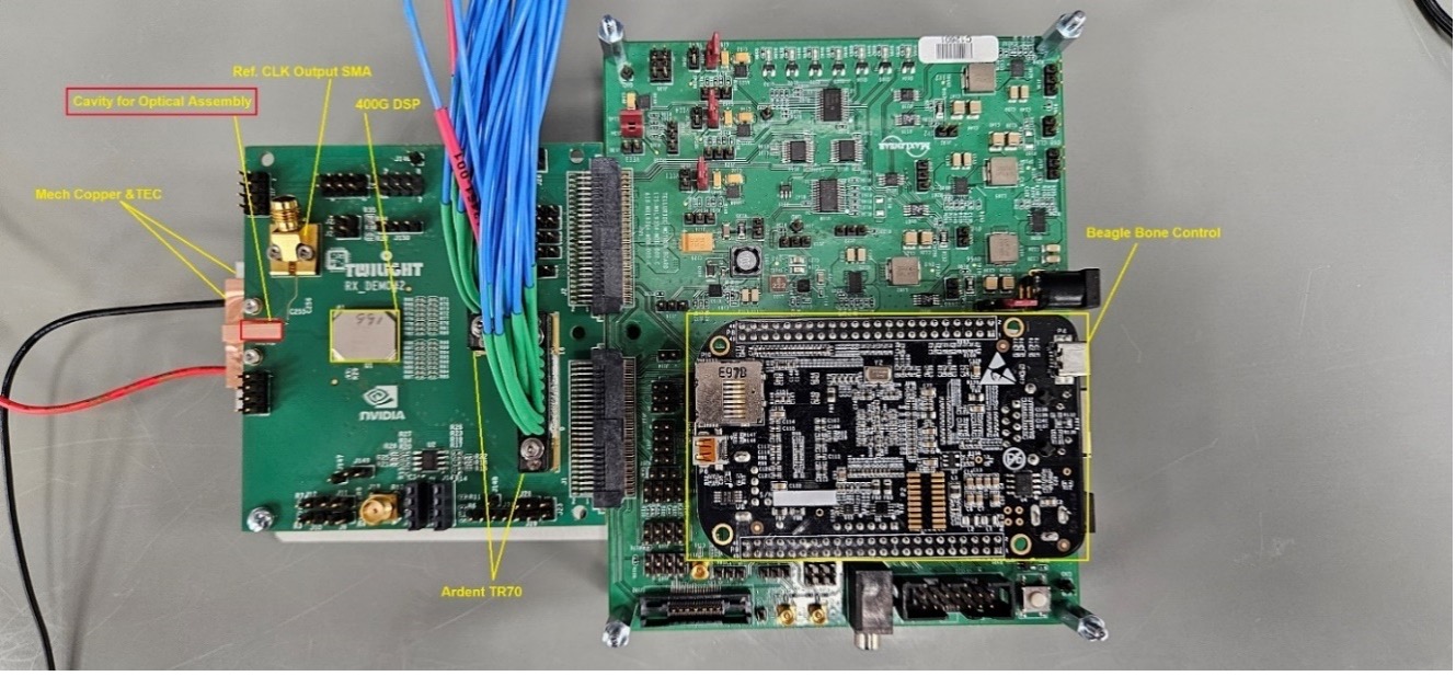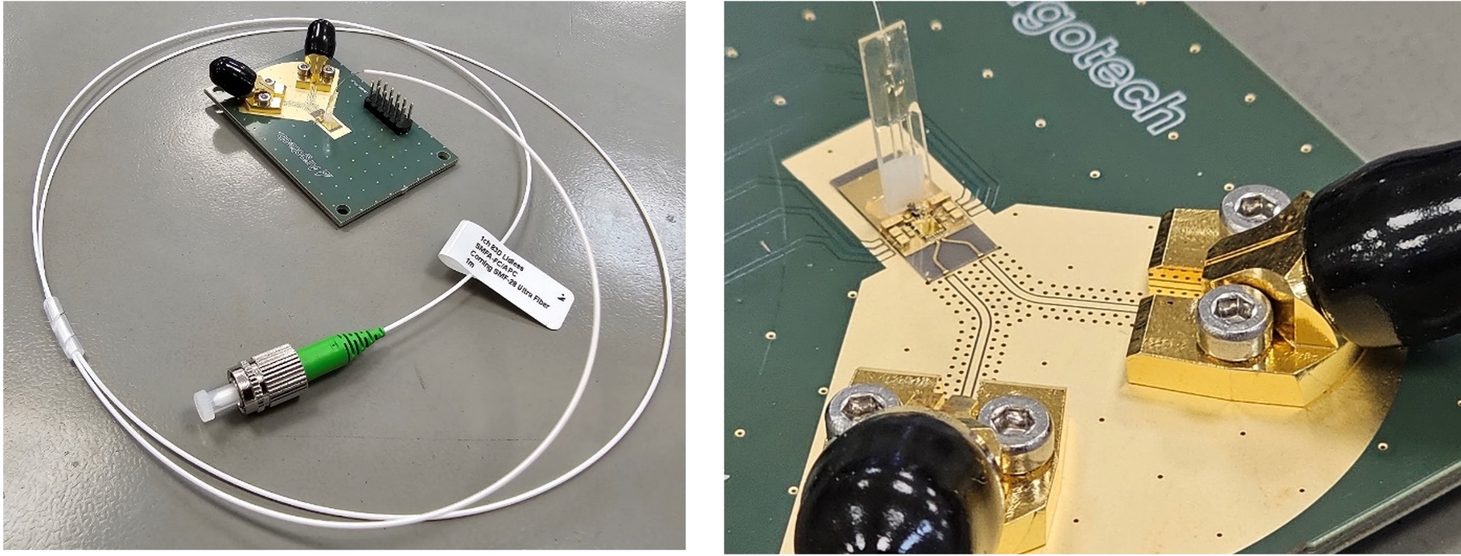 WP5: TWILIGHT has achieved one of its most challenging and innovative milestones which is the development and validation of a significantly improved process flow for the co-integration of photonics and electronics components at wafer scale and for the first time for InP-to-InP technologies (Figure 7). Multiple co-integration tests were performed based on dedicated wafers of InP membranes and InP DHBTs to define the max temperatures and strain tolerated by the DHBTs. Post bonding alignment tests relying on soft-baked anchors achieved very high alignment accuracy (~ 2μm). Thermal studies for the co-integrated optoelectronic structure were carried out. RF Interconnection of photonics and electronics components was realized based on ultra-short vias minimizing parasitics. The developed process flow was validated by means of active dedicated wafers (Figure 8). Furthermore, the ceramics interposers for assembly of the optoelectronic chips were designed and fabricated. Further assembly was performed on the host PCB which was designed and developed to carry also the driving and control electronics and the DSP chip. Two variations of receiver modules were delivered on evaluation board suitable for testing with external test and measurement laboratory equipment (Figure 9 and Figure 10). The corresponding receiver PCBAs were prepared and tested (Figure 11 and Figure 12). Finally, the 8x8 switch modules were fully assembled on PCBA and tested (Figure 13).