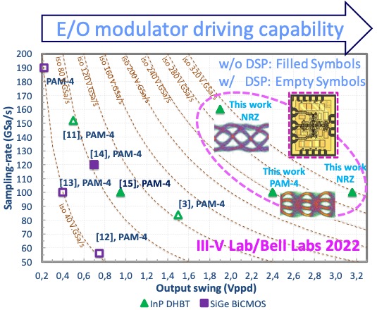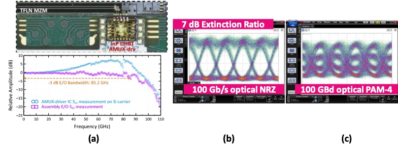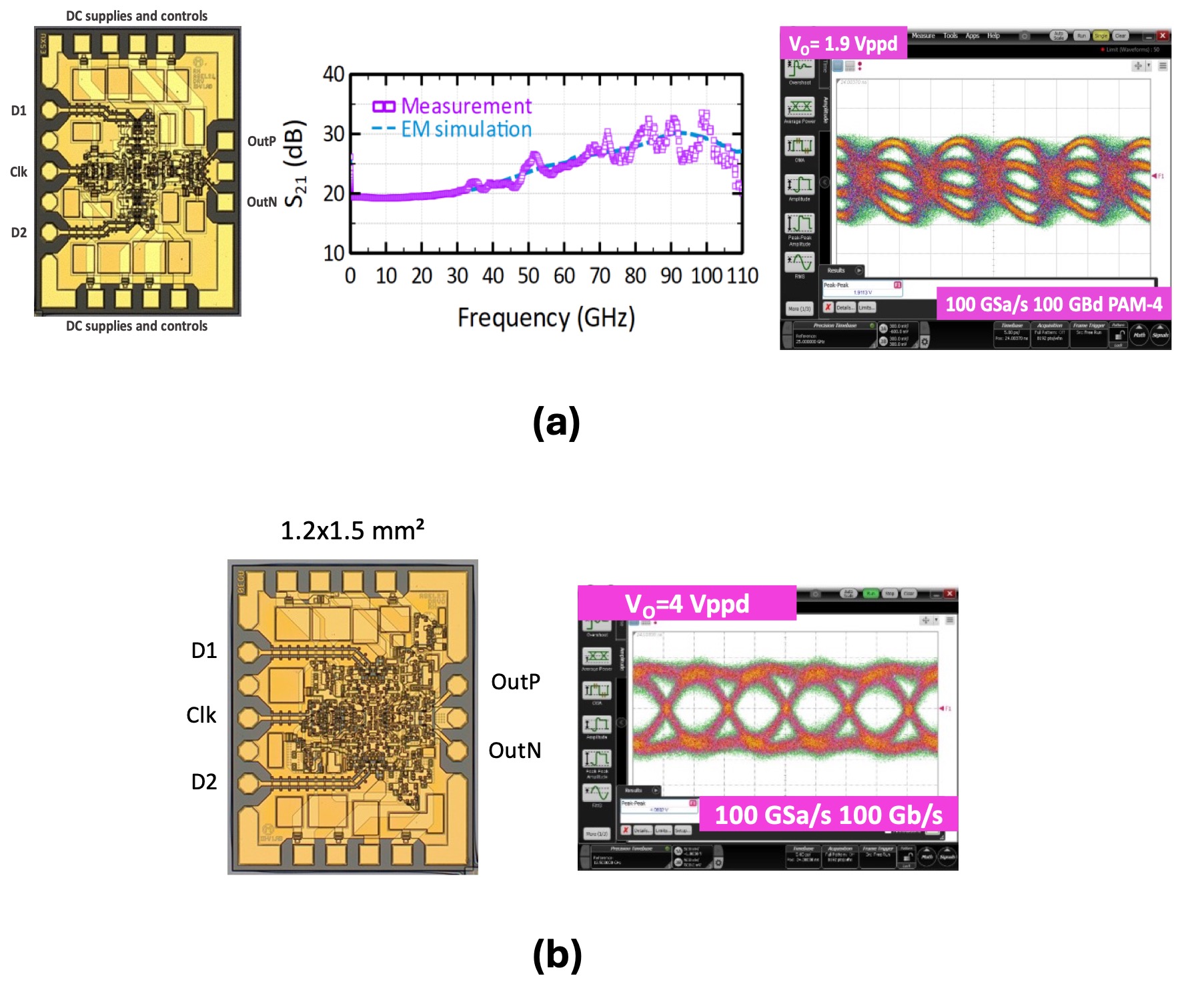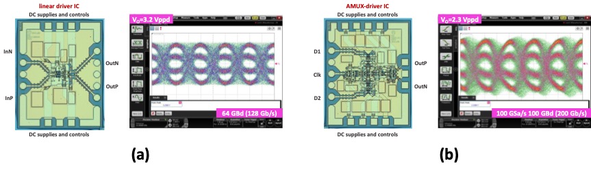 WP4: 0.5-µm InP DHBTs with improved performances have been developed demonstrating 450/530 GHz cut-off frequencies, along with a breakdown voltage above 4V. Based on this technology, a monolithically integrated analog multiplexer-driver (AMUX-driver) IC has been designed, fabricated and characterized demonstrating record performances up to 200 GSa/s operation in NRZ with a 1.4 Vppd output swing, without any support of DSP or equalization (Figure 5(a)). A second generation of AMUX-driver IC was designed and fabricated in the same technology and showed 4-Vppd at 100 Gb/s for NRZ modulation (Figure 5(b)). Both AMUX-driver IC generations show the highest performances in terms of driving efficiency with respect to the current state-of the-art. At the receiver side, standalone linear transimpedance amplifiers (TIAs) were designed and fabricated on the 0.5-µm InP DHBT process showing 50~GHz electrical bandwidth with 220 mVppd output swing at 64 Gb/s (Figure 6(a)). In addition, an analog demultiplexer (ADeMUX) was developed with good functionality at 50 GSa/s (Figure 6(b)).