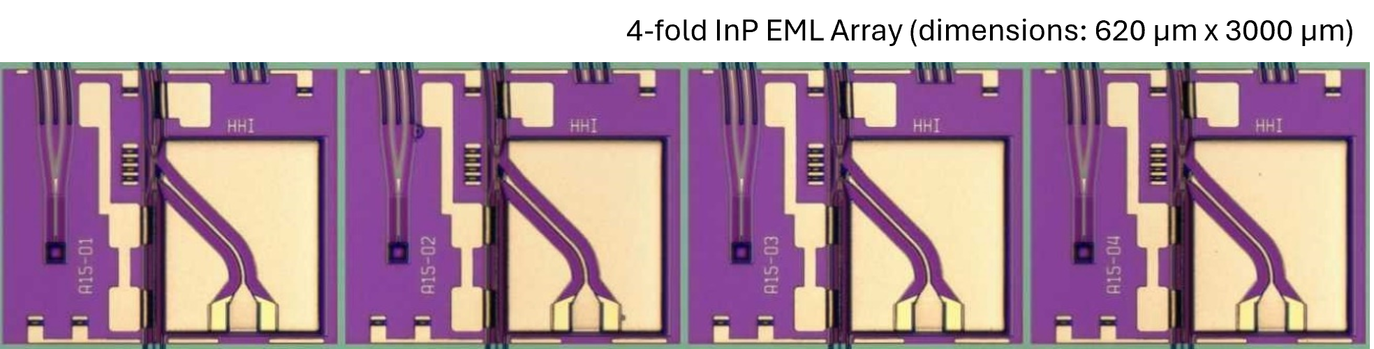 WP3: All photonic components and motherboards of POETICS prototypes have been developed. High-speed 4-fold InP EML arrays (see Fig.1) designed and fabricated for uncooled operation in the O-band, together with high-bandwidth PD arrays. InP phase section arrays (edge-coupled and flip-chip compatible), InP gain chips, balanced PD arrays, and a narrow linewidth tunable laser (output power of >40mW, ~140nm wavelength tunability) (see Fig.2) have been successfully developed. 2D PolyBoards for the optical transceiver modules developed and upon significant improvements in the fabrication process and implementation of new basic components the 3D PolyBoard MCF interposer, manufactured. For the coherent modules, 2D PolyBoard fabricated and several building blocks have been developed for the TriPleX part, e.g. 2x4 MMI based hybrid mixers and RF-lines. Finally, a dedicated multilevel etch depth process was developed to enable the flip chip assembly of InP chips onto the TriPleX platform and a completely new manufacturing process was developed for the successful manufacturing of the flip-chip compatible PolyBoard.