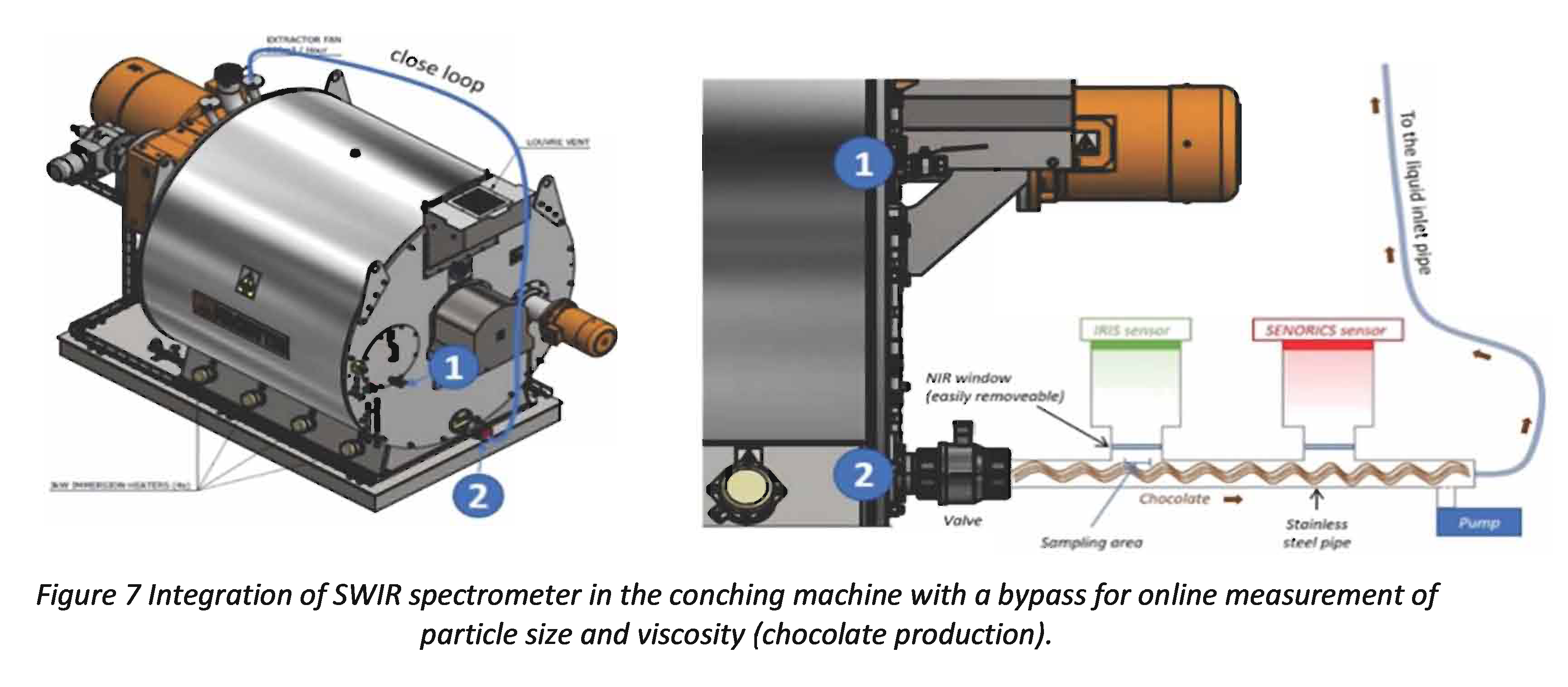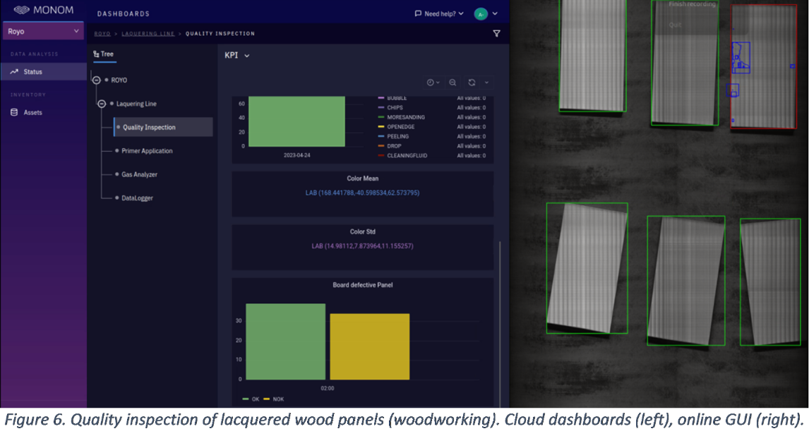 iv. Development of Multimodal in-line process monitoring solutions. The multimodal monitoring systems are combinations of technologies (novel spectral sensors and edge devices with AI capabilities for online data processing) for different use cases. Monitoring system to measure temperature and steel composition (steelworking), quality inspection of lacquered panels for defect detection and colour check, estimation of impregnation layer thickness (woodworking), monitoring of tempering, monitoring of gloss in chocolate (food production). Different exploitation strategies are assessed by system integrators RUSSULA, SCM, IRIS