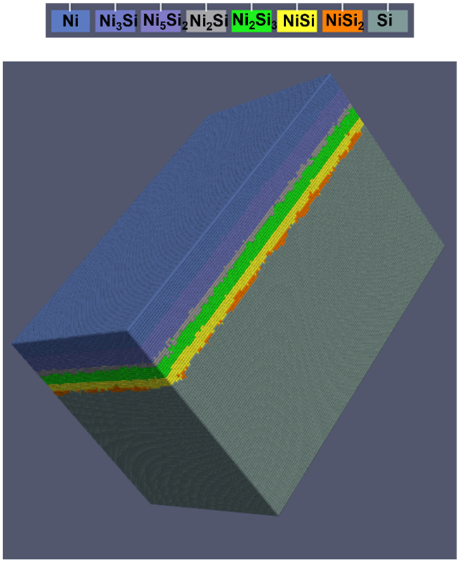 The formation of nickel silicide even exceeds the capabilities of atomistic Lattice Kinetic Monte Carlo (LKMC) approaches. We developed an in-cell Monte Carlo simulation tool for silicidation studies which can simulate various silicide compounds, such as Pt-Si and Ni-Si, and accommodates changes in phase variables and local composition.