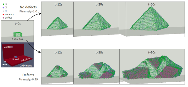 Simulation programs based on classical continuum approaches are of limited use for nanometer-sized structures such as investigated in MUNDFAB. This is because they are not able to accurately predict relevant effects, for instance the reduced electrical activation of dopants, special cases of topography modifications, or the formation and growth of defects. In particular, existing models do not allow the precise simulation of low-temperature processes, which are essential for the sequential 3D integration of devices.