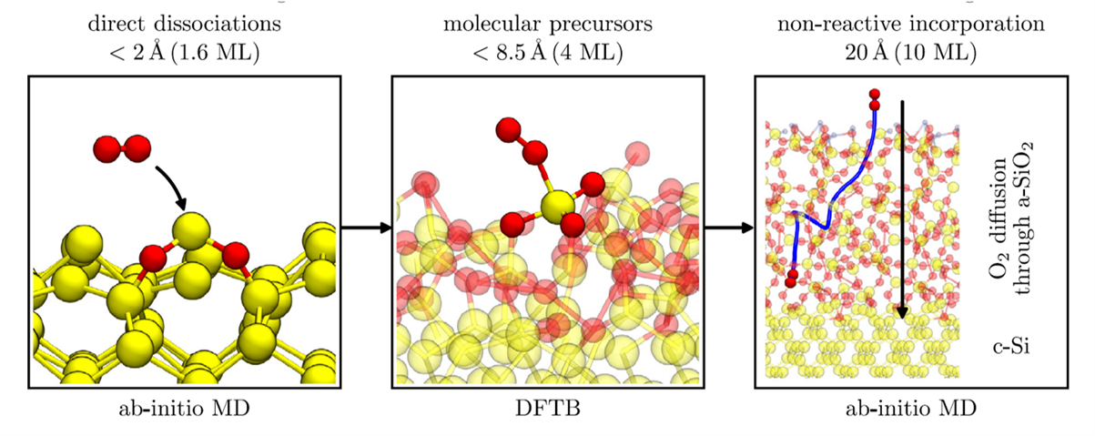 We further utilized a multi-scale approach, in which a machine-learning force-field is trained on data from DFT or other electronic structure methods like DFTB. Such a potential can then be used to study the system dynamics with ab-initio accuracy on much bigger systems. This approach allowed us for the first time to simulate all atomistic details of the whole silicon oxidation process.