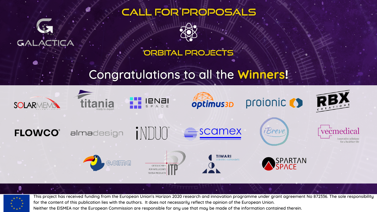 • Orbital Projects voucher aims to support the demonstration of new cross-sectoral value chains connecting the different sectors of GALACTICA with initial market tests of the products and services developed. Each Orbital Project had a budget up to 100k€ and we funded 19 projects.