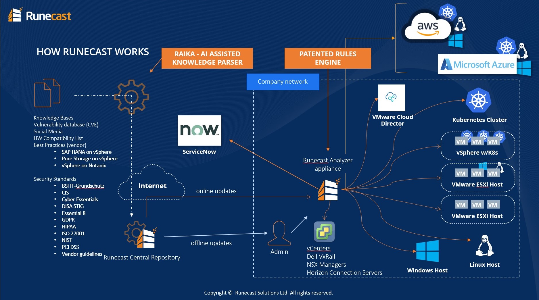 It is designed as a powerful breakthrough technology, adding Artificial Intelligence and an end-to-end automation overlay to Runecast Analyzer. It can analyze a wealth of unstructured human readable data automatically, extracting the meaning to proactively identify potential issues and security vulnerabilities. This will bring tangible benefits to organizations, their customers and society: