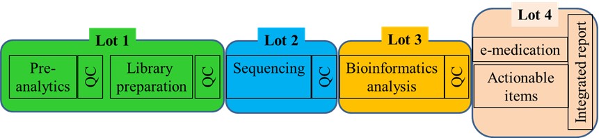 Driven by patient and clinical needs, two innovative diagnostic NGS workflows from sample-pre-analytics to supporting medical decision-making were to be developed for routine diagnostics of common and rare adult and paediatric cancers considering regulatory requirements of in vitro diagnostic medical devices (IVDs). Figure 1. Modular design in 4 Lots of the integrated NGS workflow