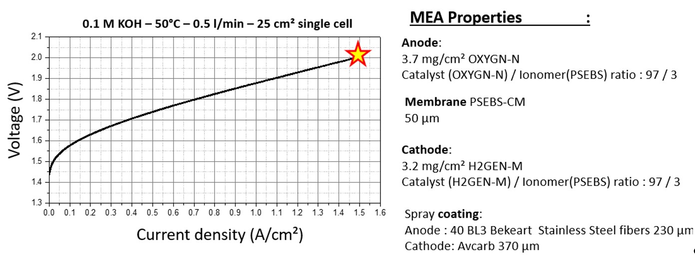 The potential of the CENmat non-noble metal catalyst was demonstrated in CENmat test cell using commercial AEM, ionomer and PTL. In 0.1 M KOH 1.85 V @ 2 A/cm² was achieved.