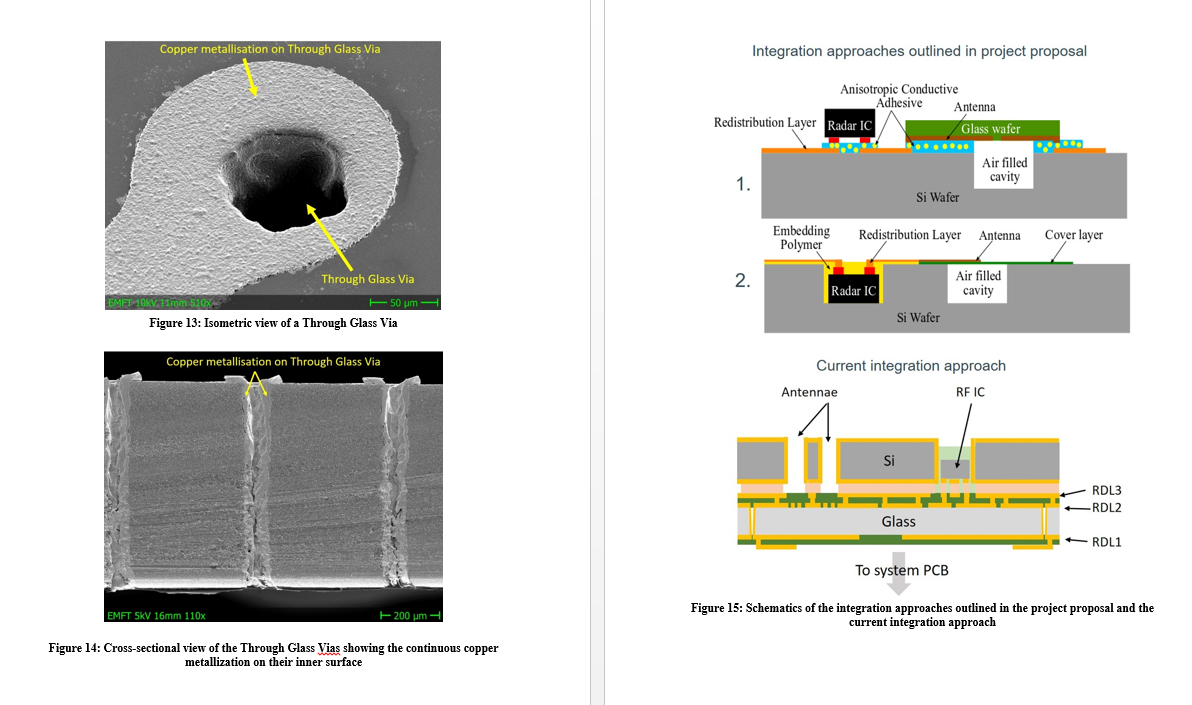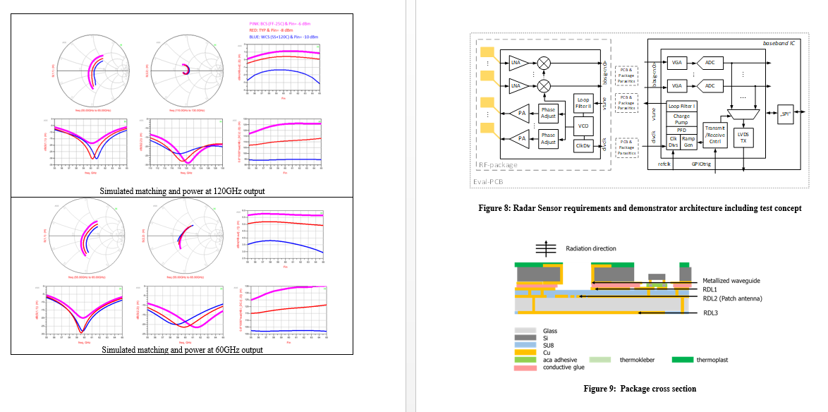 Thin RADAR IC for 120 GHz applications will be embedded in cavities of a silicon base wafer or into novel glass-based interposer structures and electrically interconnected to an antenna that is located directly aside the IC (the total team consists of AED / FHG-EMFT / FHG-IIS / Flavia-IT / FORD Otosan / MunEDA / Sony Europe B.V. / UBWM / SiR).