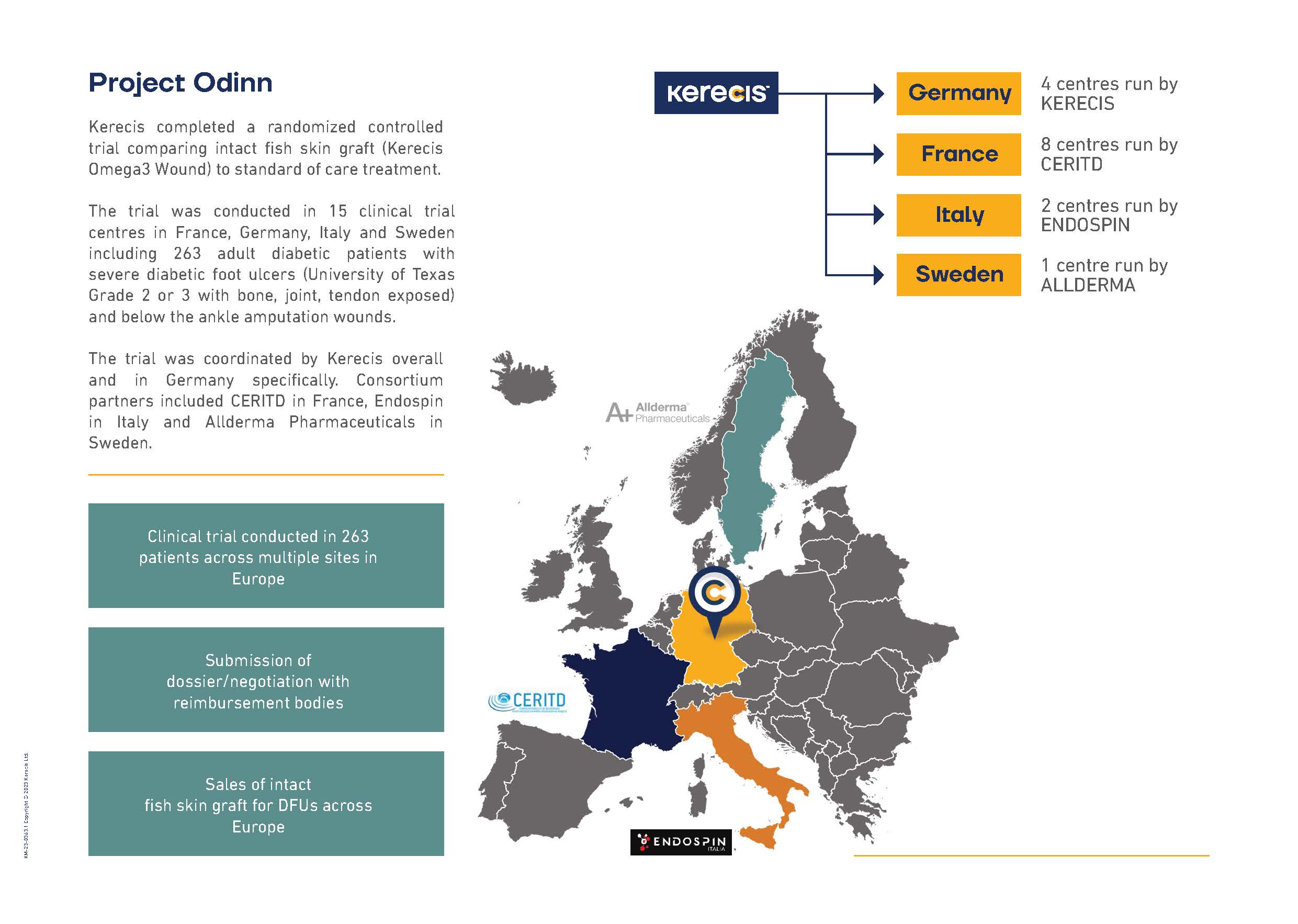In addition, with the recent transition from the MDD to the stricter MDR for medical devices in Europe, the results of the Odinn study are being used to support the clinical evaluation report required for CE Mark certification under MDR regulations. This grant has helped Kerecis to ensure ongoing patient access to a sustainably manufactured medical device with a clear clinical and economical benefit. Kerecis is working to reduce the price for health care providers and to provide greater access to this innovative device for European patients in advanced wound therapy settings. The main commercialization strategy goal was to be the first company with a intact fish skin graft used as a human skin substitute and reimbursed by the health systems across Europe.