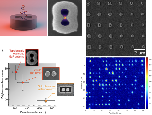 Infinity-shaped GaP nanoantennae were fabricated from a topologically optimised design investigated theoretically in the group. Nanofabrication was undergone in collaboration with LMU Munich, Germany and their enhancement was measured during a secondment at the Fresnel Institute, Marseille, France using fluorescence correlation spectroscopy. This technique is very challenging as it relies on the measurement of the brightness from single molecules in the nanogap’s volume over time. We successfully measured the enhancement of individual nanoantennae according to their gap size with an enhancement factor of up to 100-fold. The interest lies in the fact that nanogaps enhancement can be used to place emitters in their centre. This work has been presented at the CLEO Europe/EQEC conference in Munich and was submitted to a peer-reviewed journal for publication.