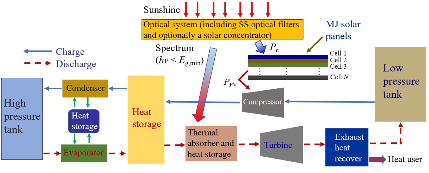 The match of the local dense distribution of fins with the region near the pseudocritical point could obtain better overall thermal performance in the modified airfoil fins heat exchanger. The front-sparse and rear-dense distribution of fins was the optimum scheme in the three distributions of the modified airfoil fins channel because its comprehensive performance is 23 % to 29 % higher than that of the uniform distribution of fins. When the channel with the spacing distribution of short rib structures was adopted in PCHE, the effectiveness of PCHE could reach 98.4 – 98.7%, the efficiency of the SCO2 Brayton cycle system based on solar power could be increased by 15.3%, and the compactness of the system could be improved by 3.8%. A concentrated photovoltaic system was integrated with advanced technologies of PV cells and CO2 battery to maximise the uninterrupted utilisation of solar energy, especially optimising the system according to the solar spectrum properties to achieve full-spectrum utilisation. The results showed that the round-trip efficiency could achieve higher than 88%, and the power produced by the turbine in discharging phase could be higher than the input PV power in the charging phase.