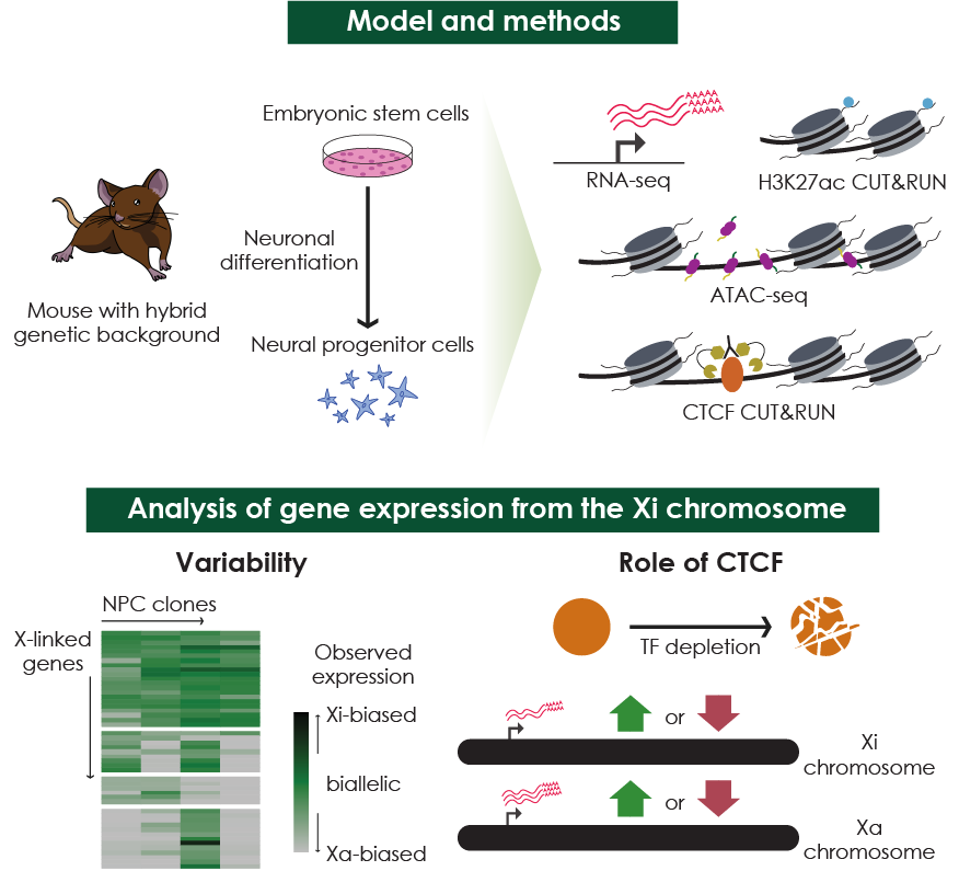 1. During the action, genomics data in clonal, F1 hybrid female mouse neural progenitor cells (NPCs) established in the hosting group were generated, to determine the transcriptional status of genes, DNA accessible regions and the presence of enhancers. As the NPC clones were derived from crosses of distant mouse species this enabled the bioinformatics analysis of the data in an allele-specific manner, to distinguish the signal originating from the Xi or Xa chromosomes. These data were used to identify enriched TF binding motifs in regulatory regions of the Xi chromosome. The motif corresponding to the architectural protein, CTCF, was detected in this analysis. As part of a collaboration in the group, genomics data to delineate CTCF binding in the X chromosomes were generated, as well as, cell lines to assess the impact of CTCF depletion in the expression of escapees. Notably, CTCF has been suggested to play a role in the process of escape since years and this work is contributing to identify its exact functions in this process.