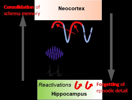 We expect for the remaining period to be able to show that the formation of abstracted schema-like memory during sleep relies on synaptic mechanisms activated in neocortical networks in conjunction with slow oscillations and spindles during slow wave sleep. On the other hand, we expect to be able to show that synaptic mechanisms related to forgetting of memory (down-scaling) during sleep, are preferentially established in hippocampal networks in conjunction with ripples during slow wave sleep and in conjunction with EEG theta activity during REM sleep.