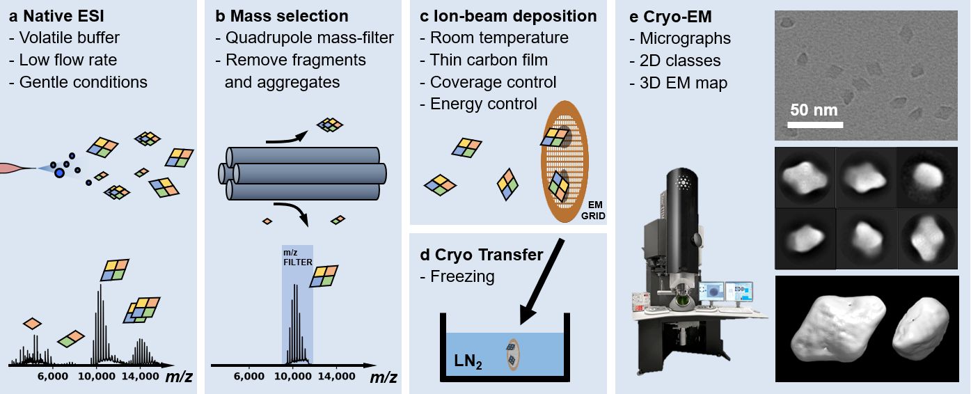 Complementary information, in particular from mass spectrometry (MS) based techniques can help to find optimal sample conditions, interpret and refine 3D structures, reveal native binding sites and strength, and provide information on small ligands and flexible protein regions. By combining native MS and electrospray ion-beam deposition (ES-IBD) into a novel workflow, termed native ES-IBD, the current project aimed at making preparation of cryo-EM samples of protein complexes more reliable and selective and allow for unambiguous assignment of complementary information from mass spectrometry to high-resolution structures from cryo-EM.