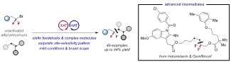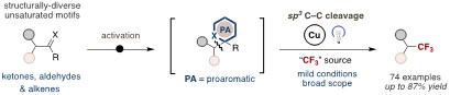 (2) Taking into consideration the above considerations, we have recently took these conceptions one step-further for enabling sp3-sp3 bond-forming reactions within the context of trifluoromethylation events via C-C bond-functionalization by combining the virtues of photoredox catalysis to generate open-shell species and the flexibility exerted by simple and readily available Cu catalysts to incorporate the trifluoromethyl group into sp3 backbones (Angew. Chem. Int. Ed. 2023, 62, e202214633). In addition to this, we have demonstrated that photoredox catalysis is a perfect vehicle to incorporate difluorinated backbones into sp3 architectures, constituting an opportunity to rapidly and reliably build up molecular backbones of interest in medicinal chemistry programs (Org. Lett. 2022, 24, 5109).