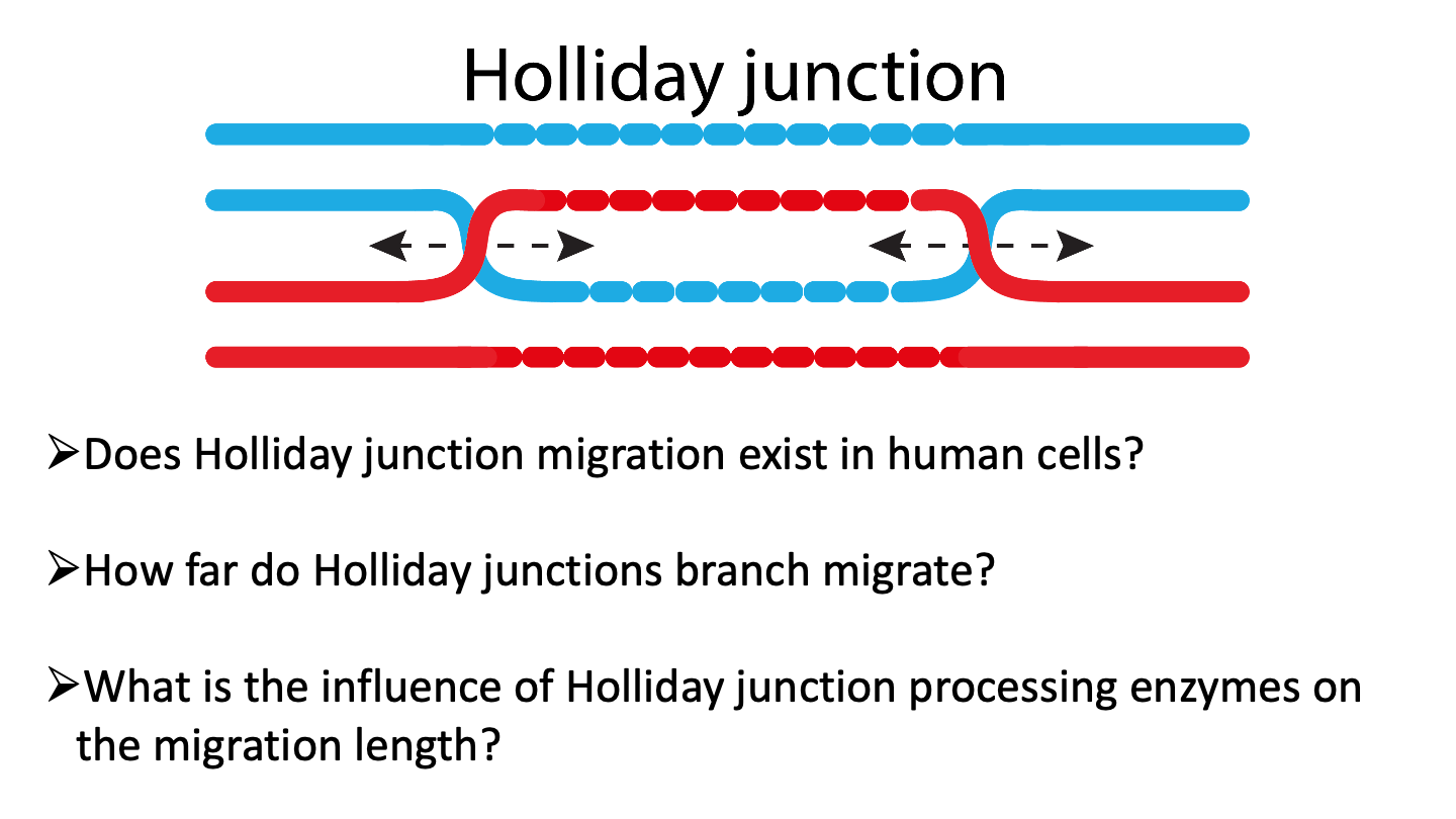 To address the questions of HJ migration dynamics, I performed time-dependent chromatin immunoprecipitation with deep sequencing (ChIP-seq) using the Holliday junction specific protein. In order to identify the length and speed of branch migration, it will be important to know the exact location of the initial DSB. Therefore, experiments were performed in synchronized DIvA (DSB inducible via AsiSI) human cells expressing a site-specific endonuclease, AsiSI, which after tamoxifen treatment, localizes rapidly to the nucleus and creates approximately 80 site specific DSBs per human cell with a known origin. After several rounds of protocol optimisation, ChIP enriched HJs could be detected around the DSB sites by sequencing and qPCR. The HJ migration length could be measured for one-time point and compared with other DNA damage repair factors. More time points of S/G2 synchronised as well as G1 or unsynchronised cells have been submitted for sequencing and the analysis is pending.