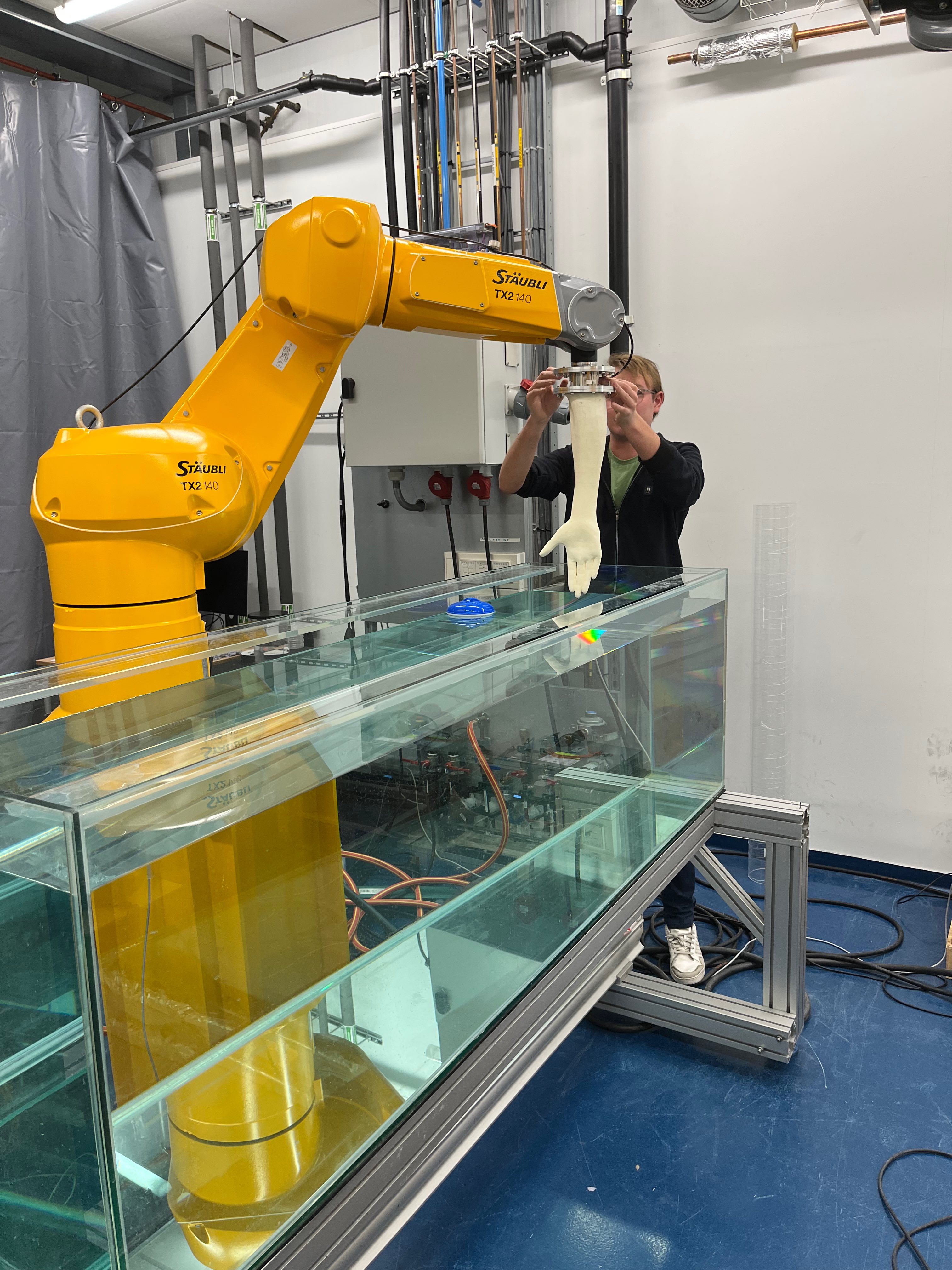 To gain further insight into these impulsive flows, a novel type of flow facility is constructed that allows to move objects in a fluid at various rates of acceleration and jerk [3]. Robotic arms and gantries are used to move around objects and allow cameras to measure the fluid motion using modern optical flow measurement techniques, such as particle image velocimetry, or PIV [4]. Most research in fluid mechanics is carried out in flow facilities with a defined velocity, such as wind tunnels and towing tanks. The flow velocity, together with the dimension of the object and the kinematic viscosity of the fluid, define the flow Reynolds number. It is this Reynolds number that is used to scale the flow. But what should one do if there is not a well-defined velocity? This typically occurs during an accelerated motion where the velocity changes over a very large range. The flow facility is built to investigate the flow scaling based on acceleration, rather than velocity.