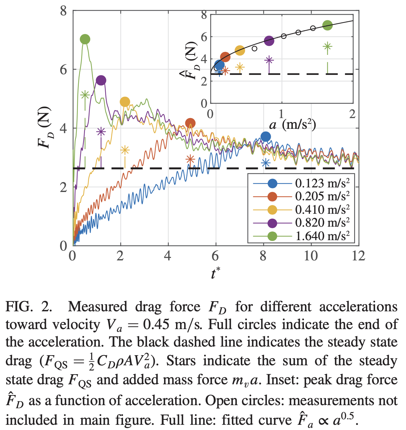 Jesse Reijtenbagh is investigating the scaling of an accelerating object. While the new facility is under construction, a prototype facility was used to investigate the scaling of the drag force for an accelerating plate. A careful experiment was set up, using acceleration rates that span about one decade (0.1-1.6 m/s2). The experiments showed a novel scaling for the drag force that is proportional to the square root of the acceleration; this was not demonstrated before. This result is opposing what is written in all textbooks, namely that for an accelerating object the drag force, given by the added mass, is linearly dependent on the acceleration. The results were presented at the DisCoVor-2022 symposium and published in Physical Review Letters [5]. The new model not only predicts the drag force during acceleration, but also during the relaxation after the acceleration has ceased and the plate is moving at a constant velocity.