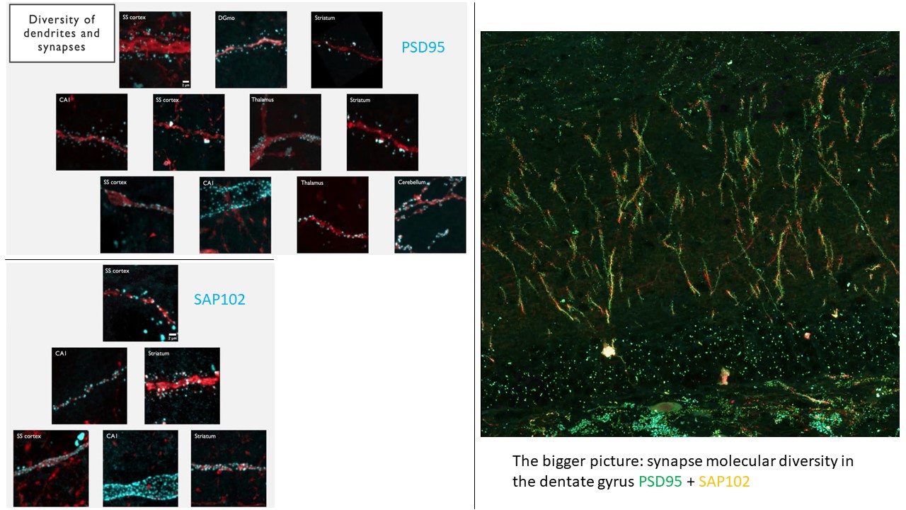 Fig. 1 provides an example of how we address the challenge of capturing and characterising the SNSA of individual neurons in and among the tangled multitude in the mammalian brain. This example is from a region of the hippocampus called CA1. We first need to ensure that we can see the whole neuron, and for this we use the bright red tdTomato dye, which fills the neuron, dendritic structures and axonal projections. We can visualise the synapses, which we can see as a cloud surrounding the dendrites, by labelling the synapse protein PSD95 with eGFP (green fluorescent protein). The bottom half of Fig. 1 illustrates how we can identify the synapses that belong to an individual dendrite (using clustering analysis), and then look at various features or ‘parameters’ (e.g. their size, intensity, roundness, solidity) of each of these synapses to see how similar or different they are not only from each other, but also from those on other dendrites. Here, the synapses are labelled with PSD95eGFP, but it’s important to note that we will be labelling several different proteins because this is our key measure of synapse molecular diversity (i.e. some synapses will contain PSD95, others PSD93 or SAP102, or any combination of these proteins). Fig. 2 provides examples of diversity in synapse (blue; PSD95 top, SAP102 bottom) morphology and in their distribution along dendrites (red) in cortex layers, hippocampus and further regions of the mouse brain including striatum and thalamus, as well as an impression of molecular diversity (PSD95 (green) + SAP102 (yellow)) in the dentate gyrus (right).