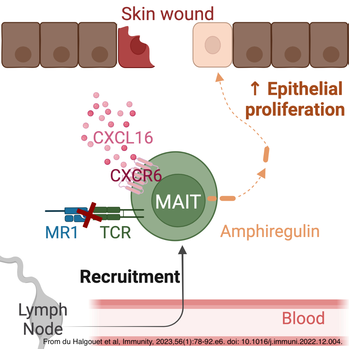We have analyzed the mechanisms underlying the tissue repair-capacity of MAIT cells to show that: 1) MAIT cell repair function does not rely on cognate interaction with MR1 in the skin; 2) MAIT cells are not long-term resident in the skin; 3) the repair functions are expressed at steady state; 4) MAIT cells rely on CXCR6 and CCL16 to populate the skin; 5) MAIT cells promote epithelial proliferation and angiogenesis during wound healing; 6) amphiregulin secreted by MAIT cells is necessary to accelerate skin wound healing; 7) MR1 expression on non-hematopoietic cells is not necessary for the repaire functon of MAIT cells.