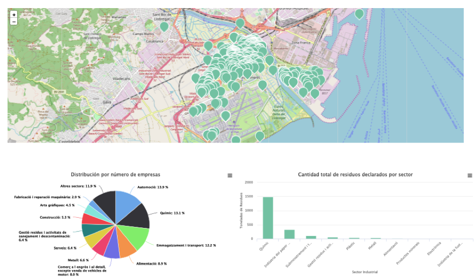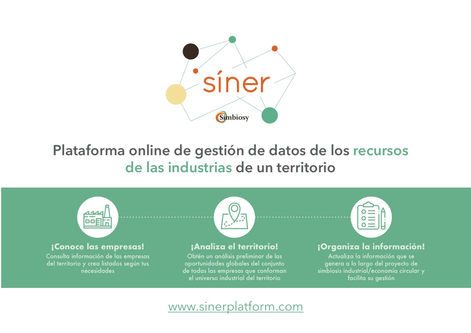 Síner is a software that can manage and estimate resources data (raw materials, waste, water and energy) of the industries of a territory, in order to identify potential synergies between companies. It gathers data from different sources and process it via Big Data tools and algorithms that are capable of estimating the unavailable data helping to identify wasted resources valorisation opportunities.