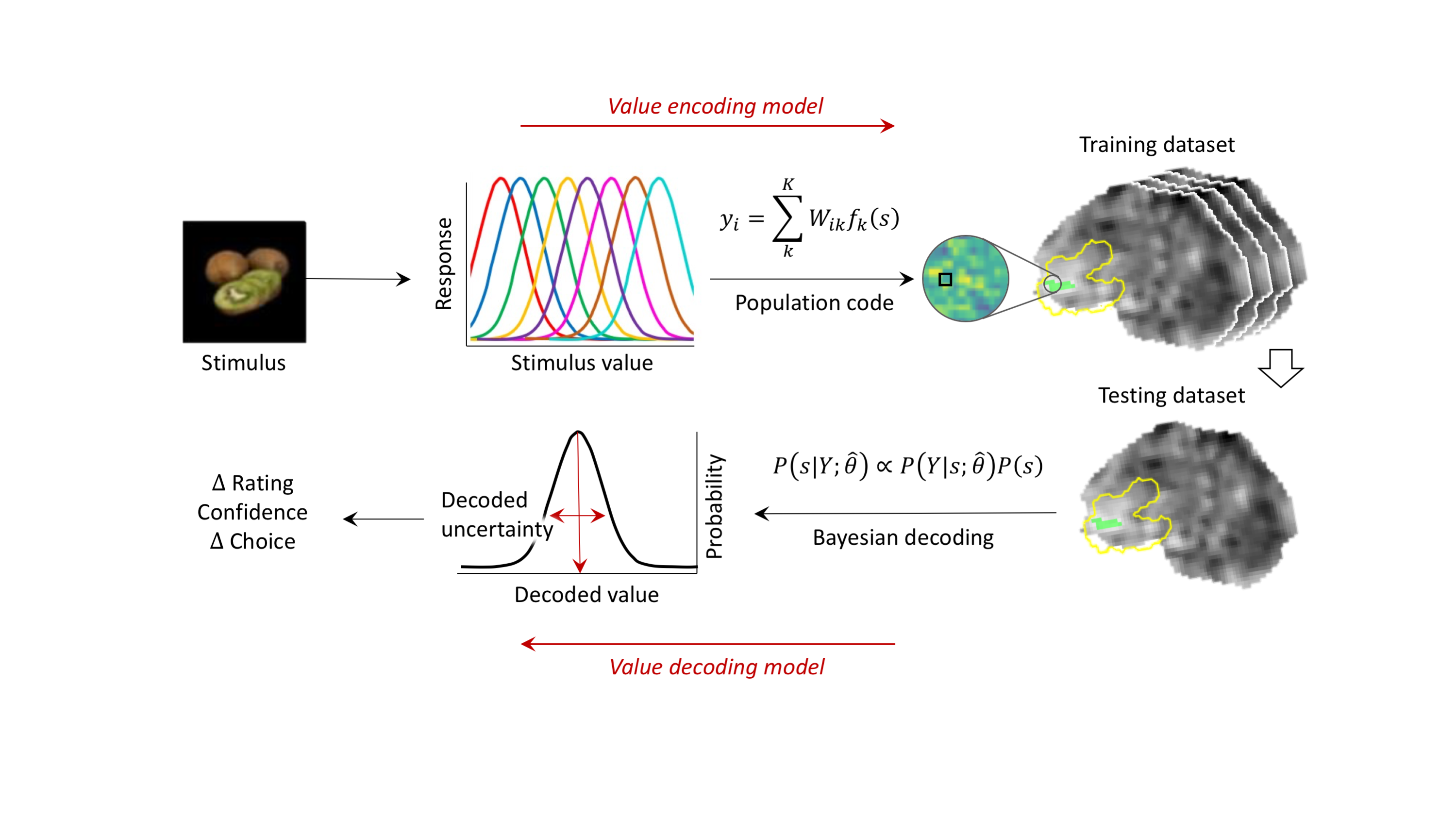 Objective 1: Deciphering the neural code for value. We know very little about how value signals are coded by neurons. Single-unit recordings in the orbital frontal cortex (OFC) of non-human primates – an analogue of the human ventromedial prefrontal cortex (vmPFC) – have identified neurons that encode the subjective value of options in a linear manner, either increasing or decreasing their activity with value. However, non-linear population codes, where each neuron is tuned to a specific stimulus magnitude, could allow neuronal ensembles to represent both value magnitude and uncertainty simultaneously. Our aim was to investigate whether the human brain utilizes such a probabilistic neural code for value.