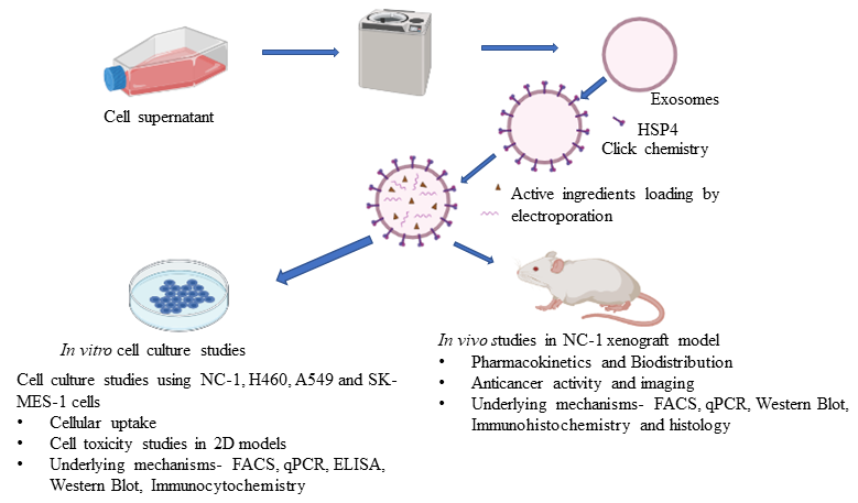 Various strategies were used to isolate exosomes from cell supernatant. NSCLC targeting peptide was developed and characterized using various analytical technologies. Bioinformatics tools were used to develop stable nucleic acid with cell uptake and imaging capabilities. Peptide was functionalized with a molecule to make it directly usable for the click chemistry. Isolated exosomes were further modified with the chemical agents so that peptide can be attached using copper free click-chemistry reaction. The developed exosomes were further characterized and then used to develop florescent dye/active ingredients loaded exosomes. Various analytical technologies were used to characterize and successfully develop functionalized extracellular vesicles. 2D cell culture models of NSCLCs were developed and capabilities of nucleic acid to lower desired the protein levels and uptake was also evaluated. Methodologies were developed to study the cytotoxic effects of small molecules and nucleic acids with the cells. Imaging studies were also performed to evaluate the effect of small molecule and nucleic acid with the cells. The developed fluorescent dye loaded peptide functionalized exosomes were further studied for their uptake by the NSCLCs using various analytical technologies.