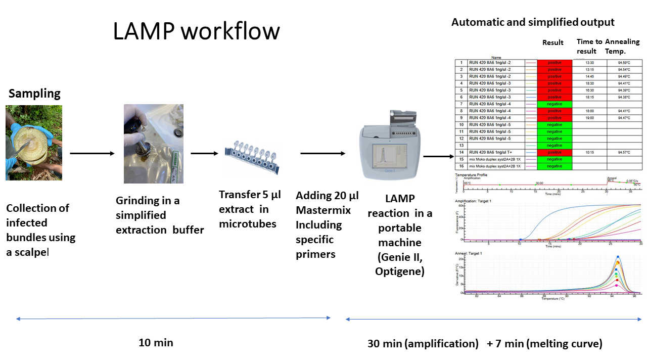 -The validation of LAMP assays . The four LAMP protocols have been validated on inoculated plants as well as field samples. MOKO disease was diagnosed by LAMP in Jamaica and from DNA samples supplied by Ecuador. Missions in Mozambique and Indonesia have been carried out for FocTR4 LAMP, in Uganda for BXW, Indonesia for BDB. Samples collected in banana plantations were directly tested by LAMP in the field or in non-laboratory environment. Reference PCR/qPCR detection were carried out by the local partners in their laboratory to compare the results. Additionally, an inter-laboratory test involving eight international laboratories, aiming to transfer the protocols and assess their reproducibility have been performed . Prototypes LAMP kits manufactured by the industrial partner Qualiplante, randomized samples as well as protocols and guides were sent to the laboratories. Very high reproducibility, repeatability, diagnostic sensitivity and specificity values were obtained.