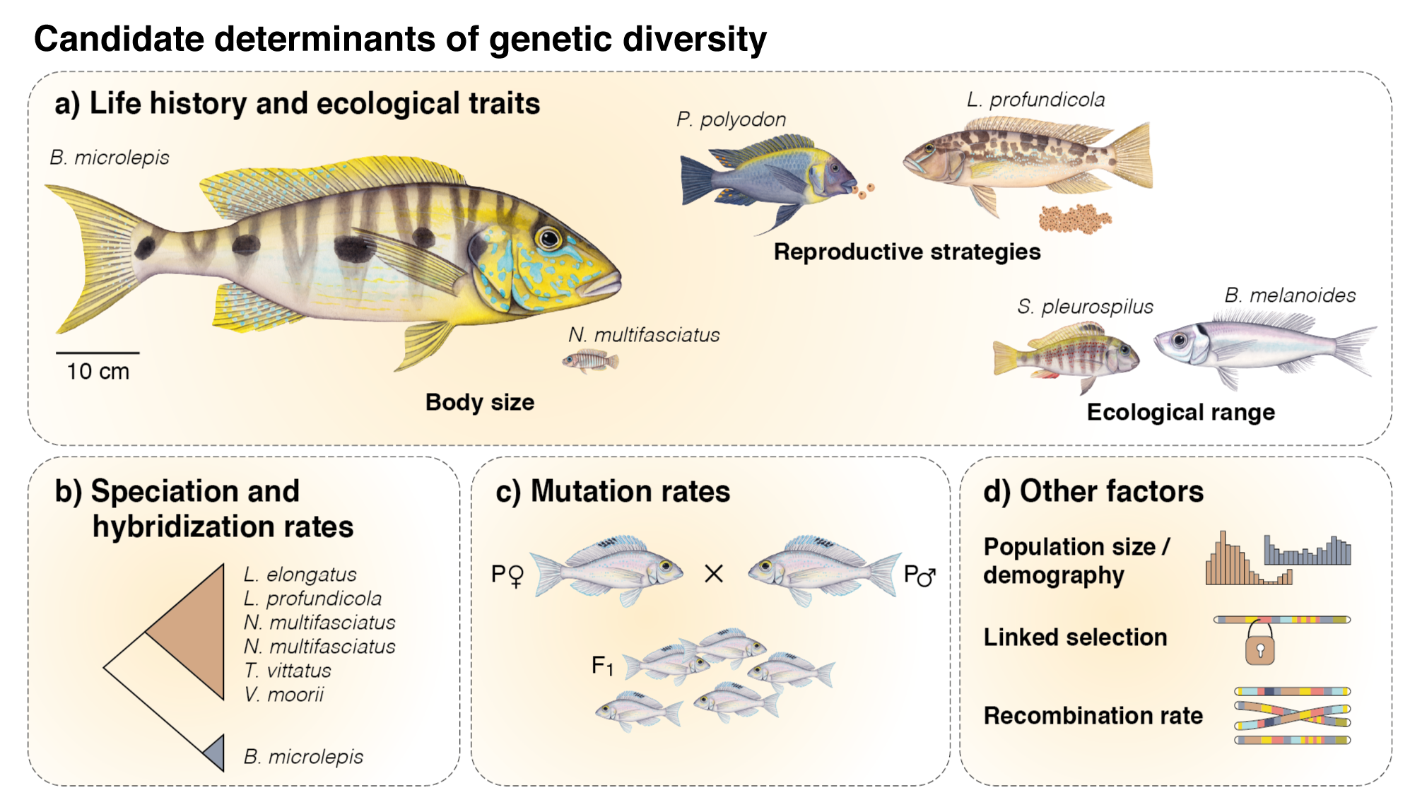 What is the relative contribution of the de novo mutation rate to genetic diversity? To answer this question, I raised fish families in aquaria, sequenced their DNA (WP 1.2) and screened their genome to find new mutations (WP2) – changes in the DNA that are present only in the offspring and not in the parents. On average, these fishes have about seven new mutations per generation. This rate can vary quite a bit between different species, with some having rates as much as six times faster than others. Interestingly, species with more mutations belong to taxonomic groups that are also more species rich. However, population size and other factors need to be considered.