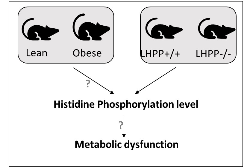 The main aim of the present project was to determine whether protein histidine phosphorylation plays a role in obesity-associated metabolic dysfunction. Thus, we determined if obesity modify global histidine phosphorylation level, histidine kinases and phosphatases expression or activity, and specific protein histidine phosphorylation. Then, we wanted to evaluate whether a change of histidine phosphorylation level can impact whole-body glucose metabolism and body weight/composition by using transgenic mice deficient in the main histidine phosphatase, LHPP.