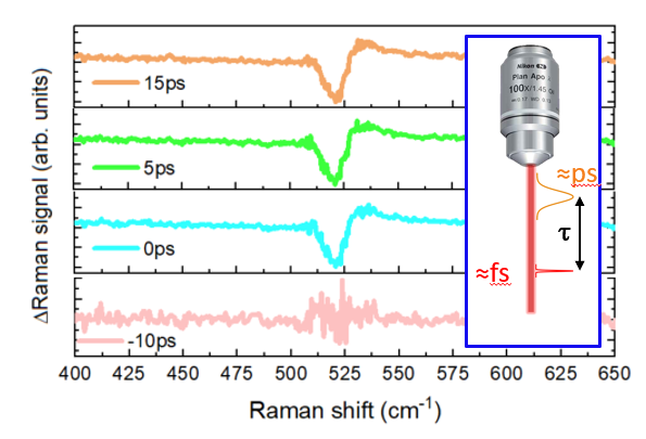 Firstly, we performed spontaneous time-resolved Raman measurements on bulk materials. Since spontaneous Raman scattering efficiency is extremely weak, we also implemented time-resolved stimulated Raman spectroscopy measurements that allow us to critially increase the Raman signal from these materials. These techniques enable us to extract the phonon lifetime of materials after excitation, which is key to better understand thermal transport at the nanoscale, as well as to extract the temperature evolution of the phonons, key to observe also exotic thermal behaviors.