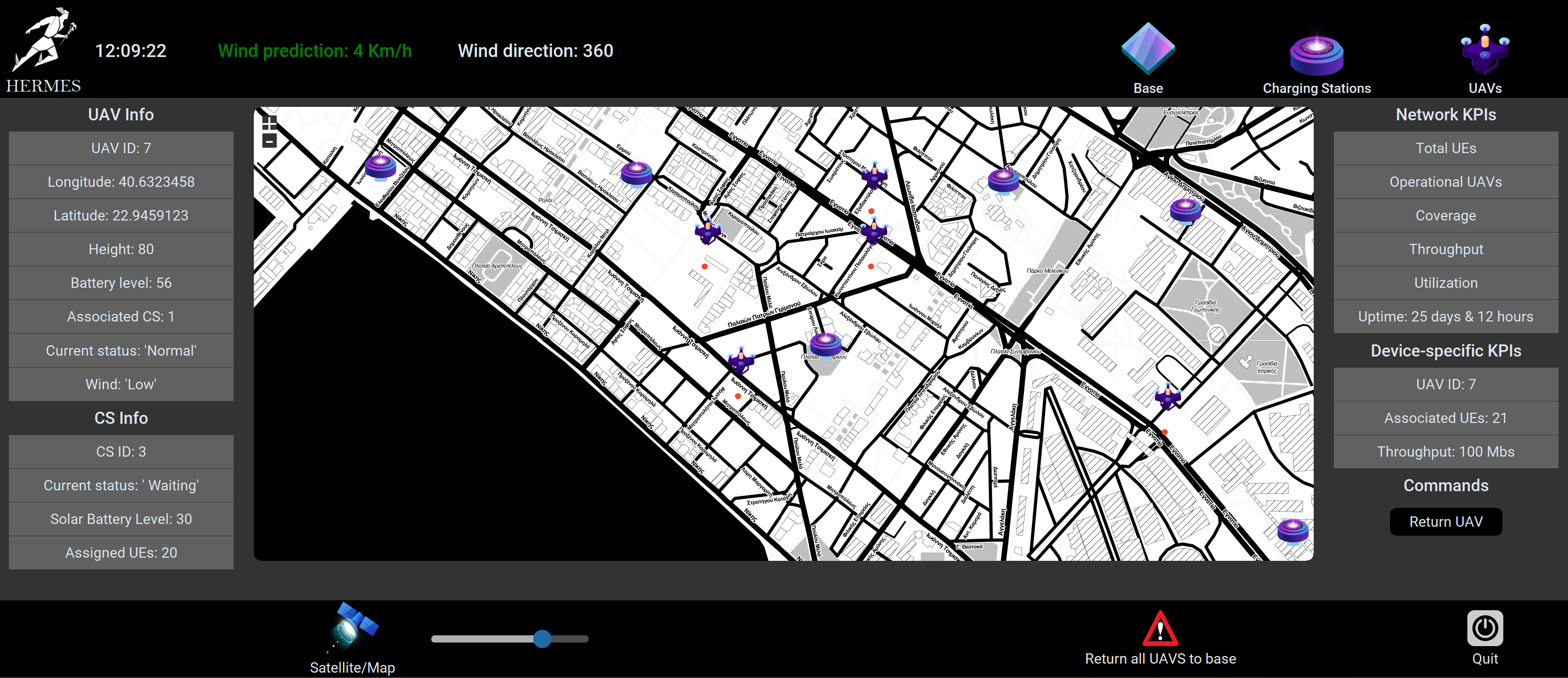 ii) High Reliability: The objective was to devise an orchestration framework that provides a reliable UAV network operation, while proving that this solution can be profitable. This work was carried out successfully in WP3 and WP4 and it was the most challenging in terms of development and prototyping. The fellow implemented the UAV orchestrator that allows autonomous operation and monitoring of the UAV network. As a result of this work, a software program was developed, which was utilized also in the experiments. At the same time, the fellow worked on an optimization framework for the orchestration and trajectory of the UAVs that resulted in two journal publications (Orchestration and profitability at IEEE IoT journal/Submitted, Trajectory optimization at IEEE TVT/Under preparation) and one conference (IEEE CSCN 2022/Accepted). Then, the fellow focused on the design and implementation of the hardware platform that synergizes with the outcomes of WP2 and WP3. Initially, the fellow implemented the UAV and then worked on the integration with the HERMES UAV orchestrator of WP3. The integrated platform transceives data through the SiK telemetry radio using the MAVlink protocol and updates in real-time the positions of the UAVs, their information details (i.e. battery level and status), as well as device-specific KPIs, as shown in the attached image.