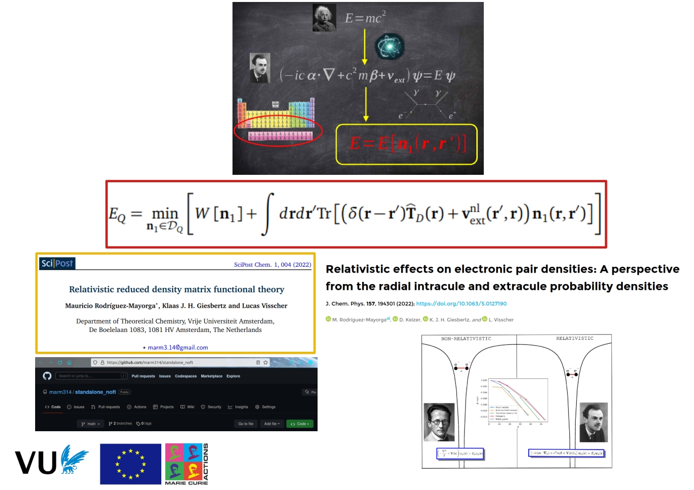 During the first year, I completed the first objective of this project and published the new theory (ReRDFMT) in an open-access scientific journal (see M. Rodríguez-Mayorga, et al., SciPost Chem. 1, 004 (2022) for more details). Moreover, this new theory (ReRDMFT) was presented to the scientific community at five international conferences. Then, the initial training period using the DIRAC program to run computational simulations to generate a database was replaced by a study of the relativistic effects on electronic pair densities using the DIRAC program. This study was also published in an open-access scientific journal (see M. Rodríguez-Mayorga, et al., J. Chem. Phys. 157, 194301 (2022) for more details). Also, this study was presented at two international conferences to the scientific community. This study unveiled new insights about relativistic effects in the matter, we observed that relativistic effects reduce the mean inter-electronic distance and bring the electrons closer together. In terms of computational software, I have also advanced in the construction of the computational software needed to run the numerical ReRDFMT simulations. This software is already available on a GitHub server (