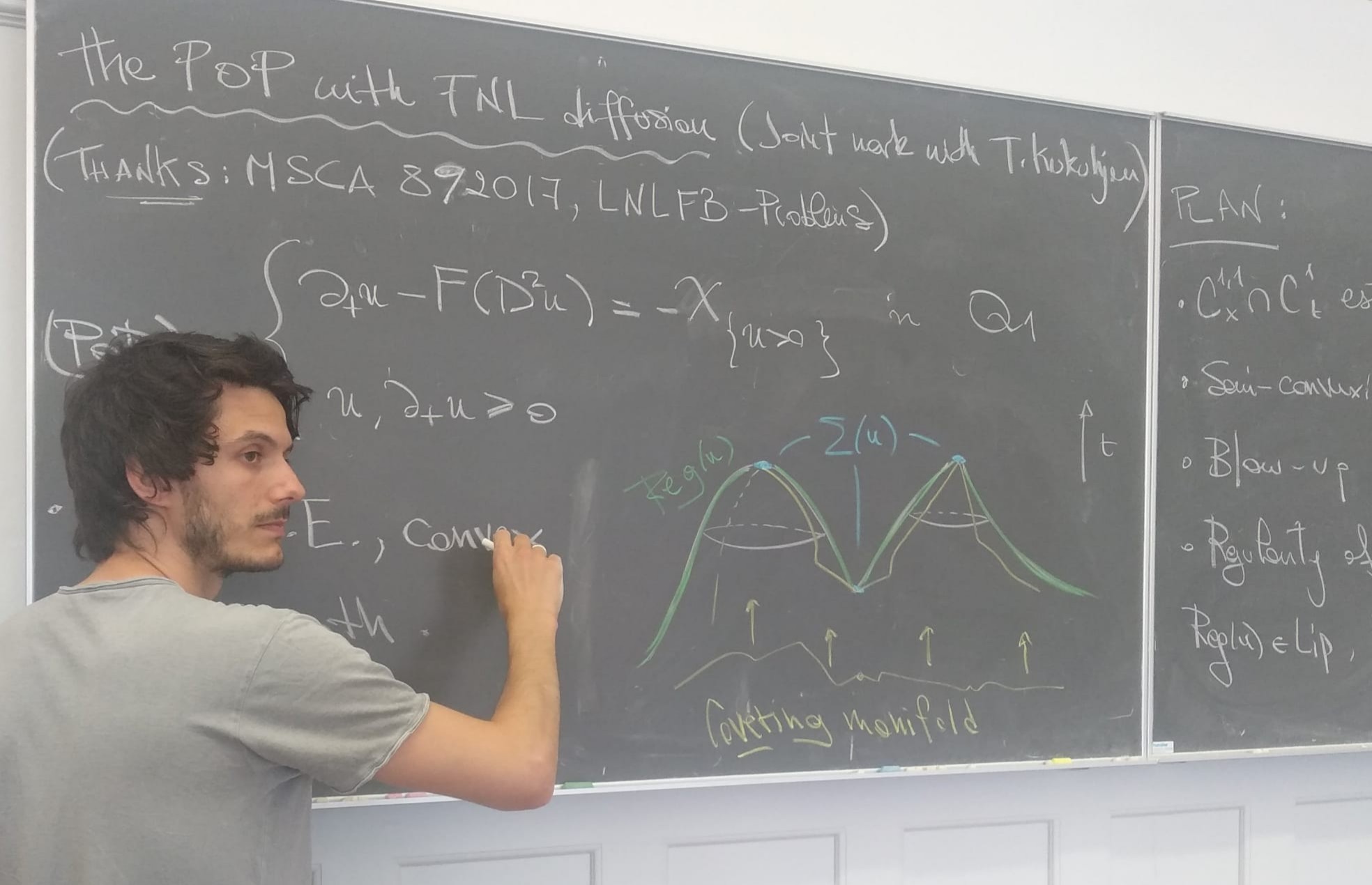 - The third and the fourth WPs are almost complete: I established some uniform Holder bounds for the elliptic perturbation of a nonlocal parabolic one-phase equation (when the diffusion process is driven by the “fractional power of the heat operator”) and, in a forthcoming paper, I will show the existence of solutions to the limit problem and the optimal regularity (joint work with T. Sanz).